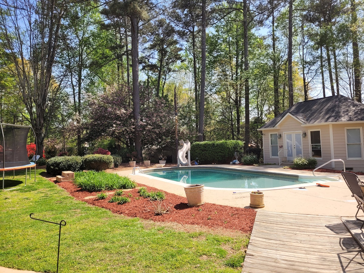Escape to this charming poolside cottage—just minutes from downtown, Trilith Studios, Fun Spot, and ATL airport. Shop, dine, and explore with ease, just 2 minutes from The Pavilion. Enjoy our saltwater pool with night lights (fee applies). Perfect for relaxing after a day of adventure. No smoking or pets allowed.