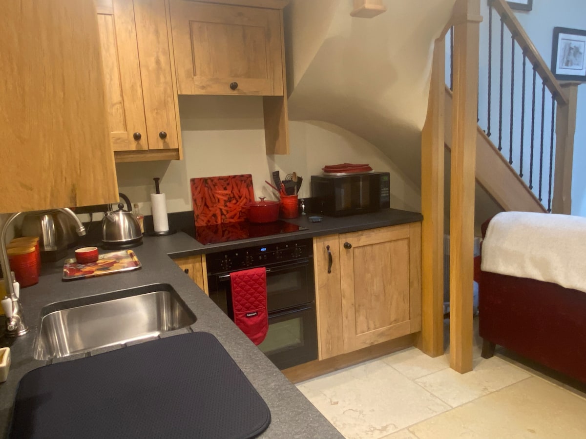 Newly built comfortable annexe connected to the side of a beautiful Georgian farmhouse. Double bedroom with lovely beams. Fitted with a small ensuite and a kitchenette fitted with a kettle, toaster, 2 ring ceramic hob, combination oven and fridge. Beautiful views of the countryside. Perfect for business trips and holidays all year round. We are close to Aston Martin and Land Rover, approx 3 miles off the M40 J12. 1.5-mile drive to the village which has a Co-Op and pub which does lovely food.