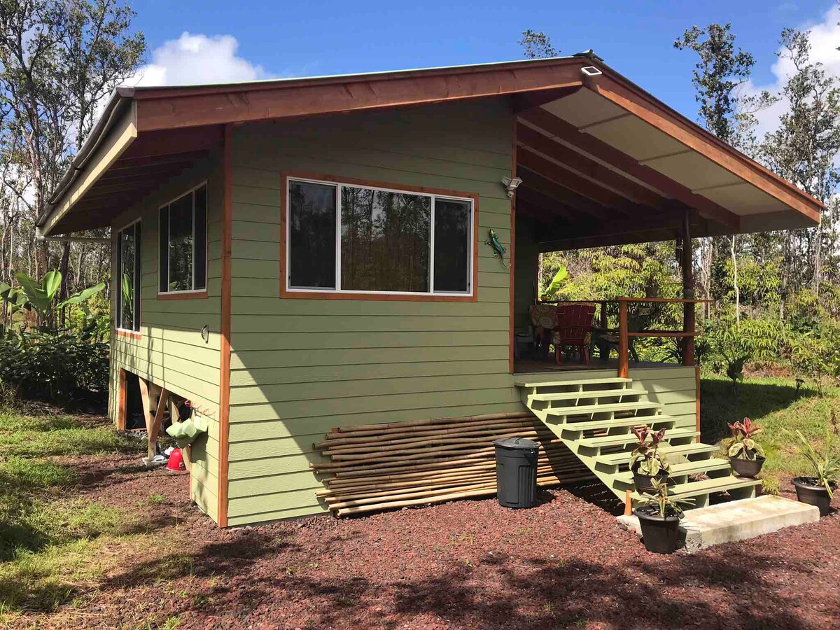 Cozy Off-Grid 'Beach Style' Cabin in the Fern Forest Countryside. Only 2 Blocks from Cement. Plush King Size Bed and Small Lanai off the front. Handcrafted Stone Basin Shower. 15 Minutes from Volcano National Park - 30 mins to Hilo. Coffee Provided via Electric Indoor Drip or Exterior Stovetop & French Press. Ask about Tropical Fruits in season on the Property!
