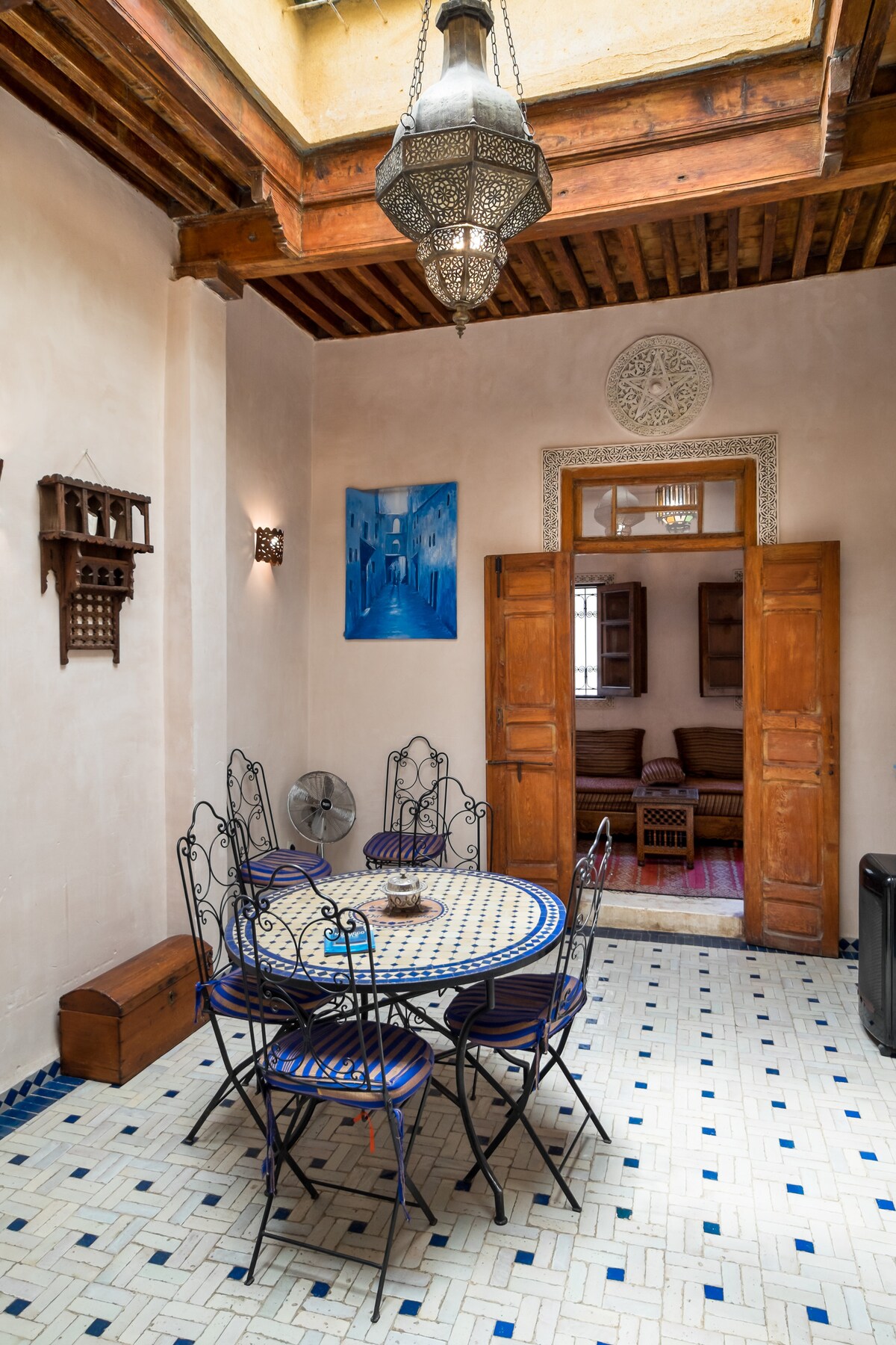 Bine ai venit la Dar El-Kendil, un riad fermecător din anii 1920, situat în inima medinei istorice din Fès! 🎨✨ Vei avea toată casa numai pentru tine. Bucură-te de farmecul tradițional marocan combinat cu dotări moderne: mobilier confortabil, decor vesel, aer condiționat/încălzire, Wi-Fi rapid și o bucătărie complet utilată. La doar 10 minute de mers pe jos vei ajunge la cele mai emblematice obiective turistice din Fès: Bab Boujloud (Poarta Albastră), Moscheea Al-Qarawiyyin, Funduq al-Najjarin și piața istorică, perfectă pentru ingrediente locale proaspete.