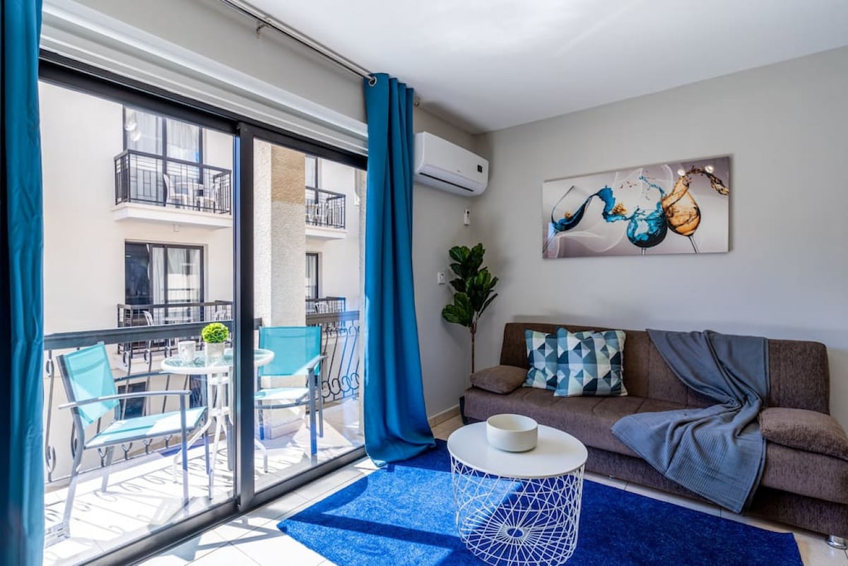 Întregul meu apartament, este format din: 1 living, 1 dormitor, 1 baie, 1 bucătărie 1 balcon frontal, excelent pentru cupluri, aventurieri solo, persoane care călătoresc în interes de afaceri. Copii >12 persoane, stai gratuit. Acces: lift și scări, pentru oaspeții cu probleme de mobilitate. Apartamentul este de 55 mp. Viteză de internet 150 Mbps. Mic dejun disponibil la cafenele de mare valoare din apropiere și la 4 minute de mers pe jos de Marea Albastră Mediterană. Restaurante, viață de noapteși mini piață în apropiere. Check-out: 12:00 - Check-in:15:00.