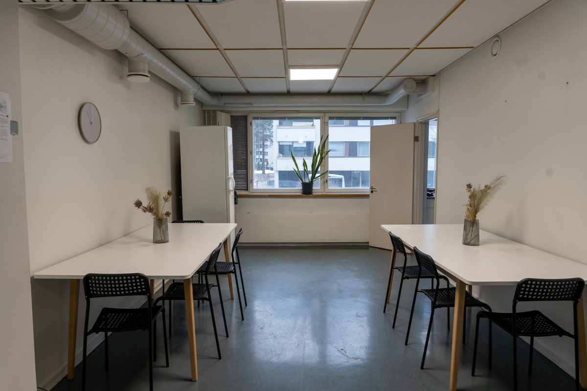 Cameră privată de hostel twin în apropiere de aeroportul din Helsinki. Camera este dotată cu televizor, veselă și frigider. Gătitul este ușor în bucătăriile comune și există o sală de mese comună confortabilă la etajul 4. La fiecare etaj există toalete ordonate, dușuri și spălătorii. Există o parcare. Lenjeria de pat, prosoapele și Wi-Fi sunt incluse în preț.