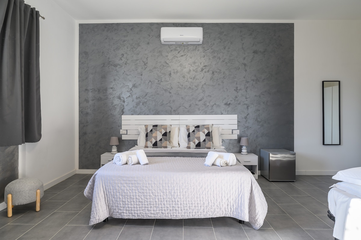 Le confortevoli camere matrimoniali large sono dotate di smart-TV, WIFI, mini-frigorifero, scrivania, asciugacapelli, condizionatore, kit cortesia di saponi ed armadi.