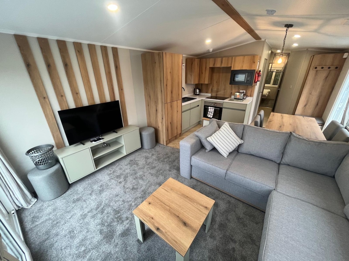 A abi Beaumont 2024 caravan sited on Cala gran close to the entrance bedding included a brand new tv in all bedrooms DVD player everything you need is in the caravan has a kettle and toaster and a microwave a built in fridge freezer a dish washer a shower room with a toilet and a shower in the main bedroom it has decking around the caravan outdoor seating and a sofa bed that folds out into a double bed two twin bedrooms and a double bedroom with it's own shower with a toilet