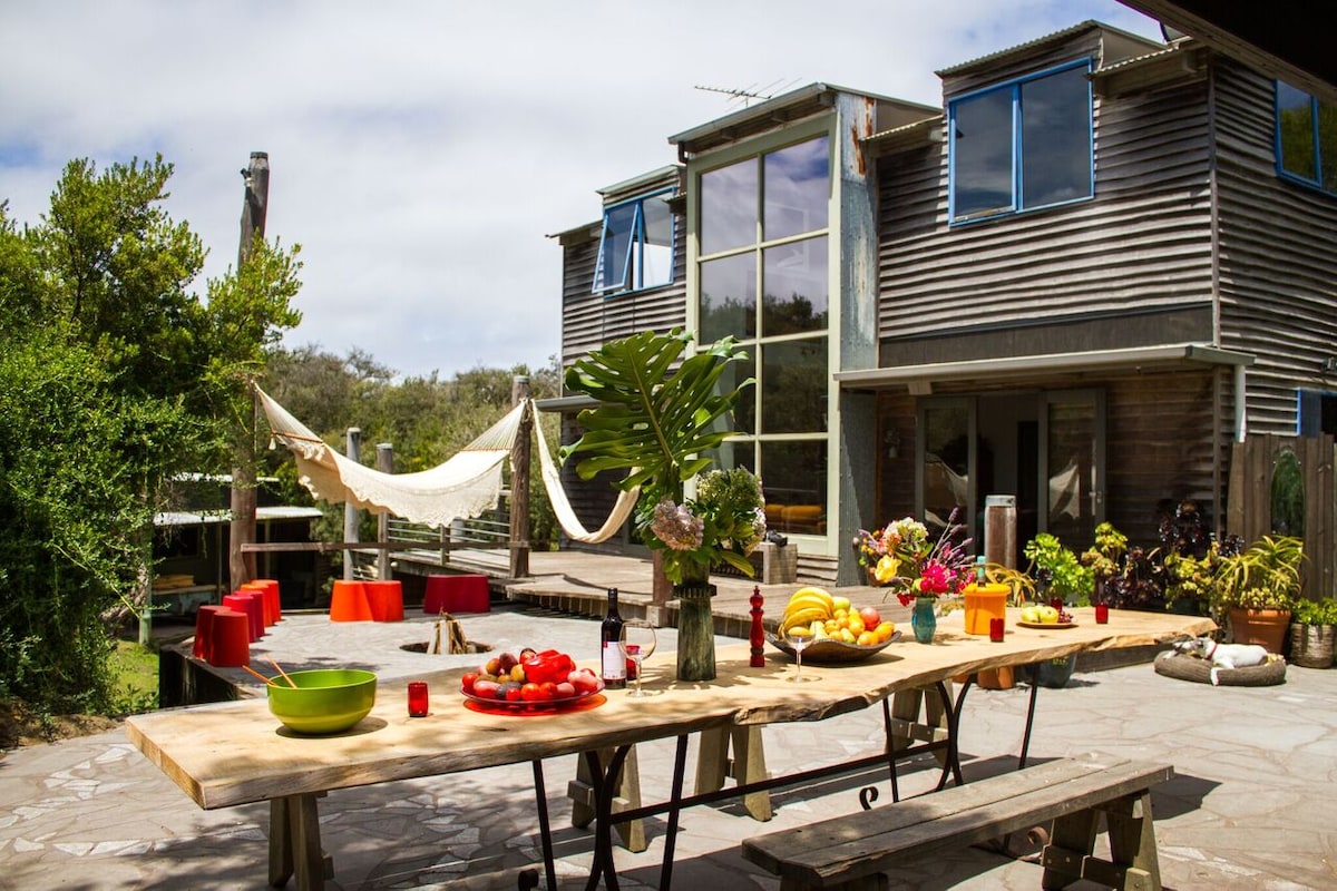 Adu-ți iubitorii, familia, prietenii, animalele de companie și jucăriile pentru a experimenta tot ce are de oferit Peninsula în timp ce stai în Eco Retreat-ul nostru proiectat arhitectural. Zona/bucătăria noastră imensă de divertisment în aer liber are o masă lungă pentru prânzuri relaxante, grătar, vatră și hamac. Casa este deschisă și luminoasă, cu o mulțime de canapele și paturi, o masă de biliard, cutie de îmbrăcăminte, glob disco, artă eclectică, cărți, jocuri, grădină de plante, duș cald în aer liber și o toaletă de compostare! Vino și joacă-te...