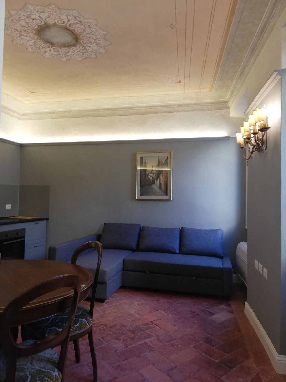 Delight in the old-world charm of this apartment featuring traditional furnishings and vintage decor under a white coffered ceiling. Fix breakfast in a warm kitchen with terra-cotta tile floors and dine at a cozy table while planning an exciting day. Furnished with great care and style in the colors of taupe, light gray and white with some details in gold and black. 55-inchTV with Netflix available to our guests, fast WIFI via fiber, heating and air conditioning. The apartment is located in a strategic position, Via Maggio n.1: in the heart of the city, between Borgo San Frediano (considered by Lonely Planet one of the coolest neighborhoods in the world) and the extraordinary monuments and masterpieces of Florence such as the Ponte Vecchio, the Uffizi Museum, Il Duomo and the elegant Via Tornabuoni with its super-chic shops. The possibility of self-check in will soon be available, especially for those who have to arrive after 7 pm. the entire apartment. We will be at your disposal to give you all informations to spend an authentic vacation in Florence! The apartment is located in the heart of Florence’s historic center, a stone's throw from the famous Ponte Vecchio and its famed jewelry shops. Take a stroll to the Santo Spirito district to discover its lively cafes and vibrant Tuscan restaurants. From the train station Santa Maria Novella you can take the taxi (just 5 minutes) or the bus number 6 and get off in Lungarno Guicciardini ( the bus stop is called "Pescaia di santa Rosa") and from there 2 minutes by walk. If you have the car you can park at the Garage Lungarno in Borgo San Iacopo 10 (+39.055.282542 - two minutes by walk from our apartment) If you book it you will avoid the fine as it is in ZTL area. From the Airport of Florence "Amerigo Vespucci" you can take the taxi (around 20 minutes) or take the special bus to reach the central train station; check the website for timetable: www.areoporto.firenze.it on item Transports. The apartment is located in ancient building at the first floor (20 confort steps to make) no elevator. The apartement can accomodate up to 3 adults (King size bed 1,80 m x 2 m, 1 confort sofa bed 1,20 m x 1,90 ) both with lattex hypoallergenic mattresses). It will be possible also to 2 adults with 2 teenagers. Our staff will attend the check-in from 04.00 until 07.00 but if you need a different time please feel to ask and we can find a suitable solution for you . Self check-in will be also available asap. The air conditioning will be at your disposal from middle of April (work in progress)