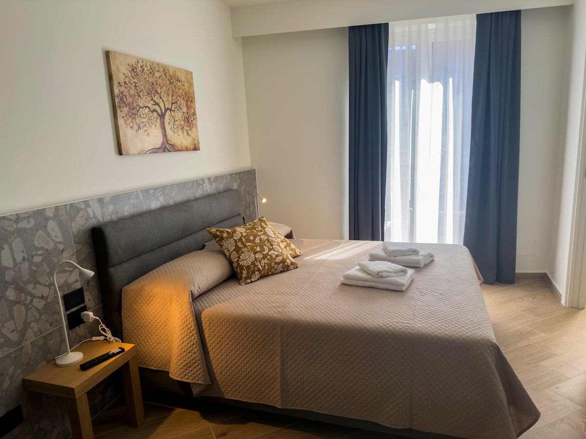 Camera Matrimoniale situata nel cuore di Giardini Naxos. Questa camera è un’oasi di tranquillità e comfort, a soli 20 metri dalla spiaggia. La camera è arredata con gusto, con un letto matrimoniale comodo e accogliente, arricchito da un topper e doppi cuscini per garantire un sonno di qualità. Per il vostro intrattenimento, la camera è dotata di una Smart TV, perfetta per guardare i vostri programmi preferiti dopo una giornata trascorsa a esplorare la città o a prendere il sole in spiaggia.