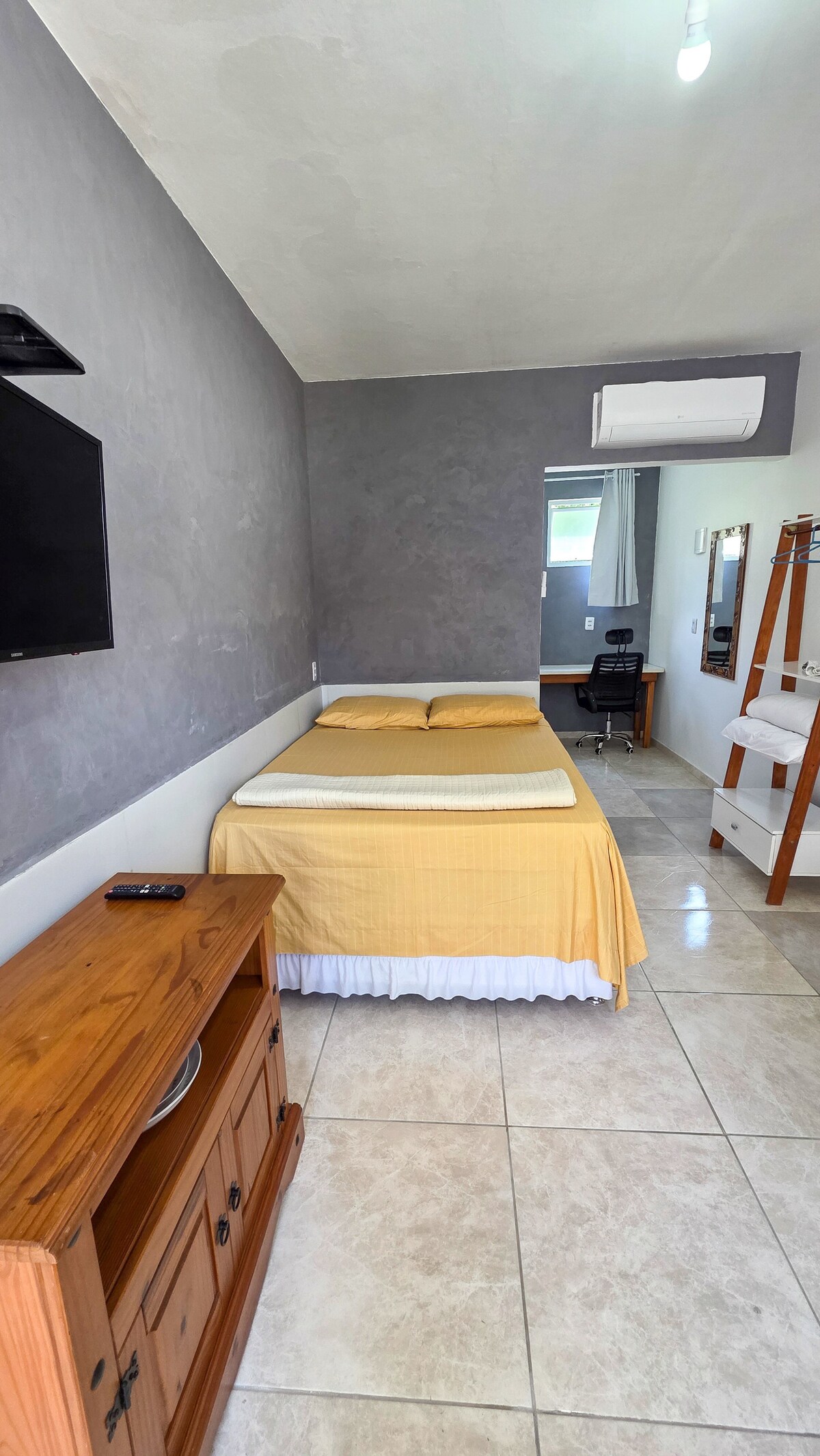 Garsonieră mare cu spațiu pentru biroul de acasă. Avem parcare cu poartă electronică. În plus, studioul are un balcon exterior la intrare, perfect pentru a sta și a mânca, a bea o bere, un chimarrão sau chiar a citi o carte. Curtea din spate este împărțită cu o altă garsonieră și casa gazdei, care se află în spate. Încă mai ai intrare independentă și intimitate totală în timpul șederii.