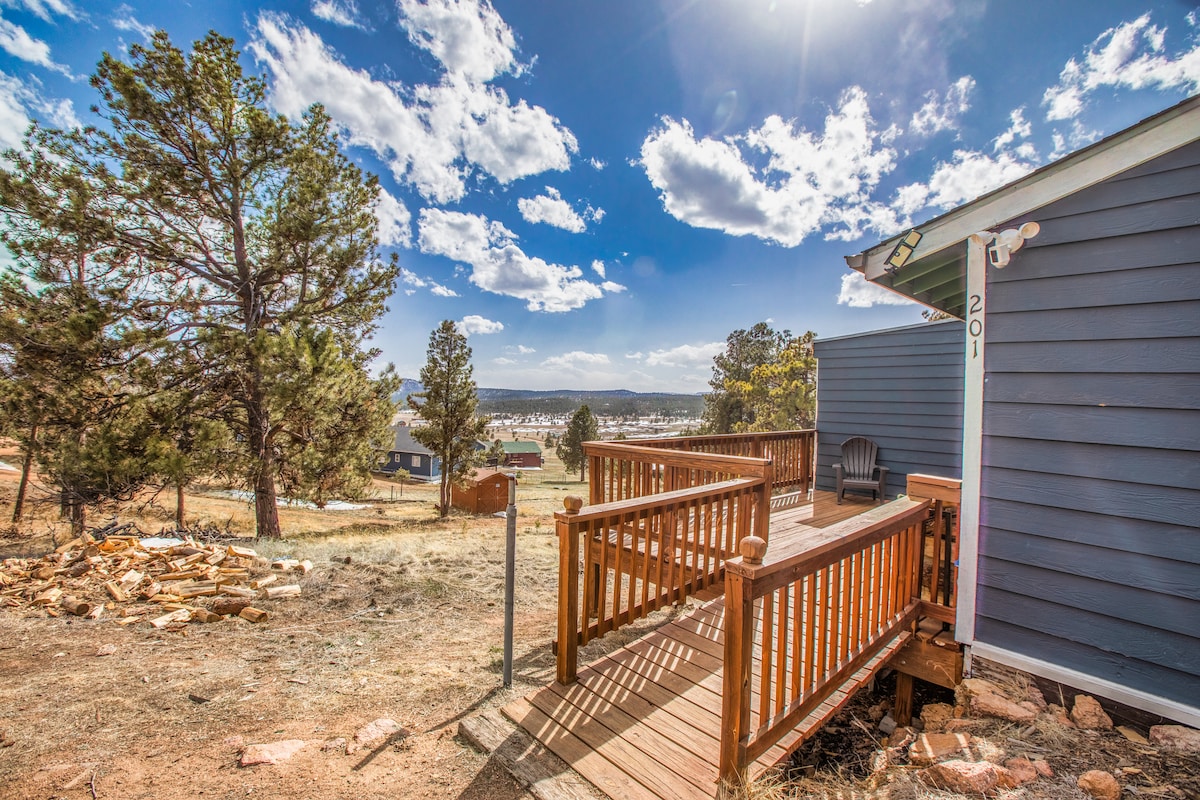 Cabină confortabilă cu 2 dormitoare și 2 băi, pe 1 1/2 acri cuibărit în pomi. Priveliști minunate oriunde în jurul punții. Zonă de zi confortabilă cu șemineu de lemn, bucătărie completă cu mașină de spălat vase. Pat matrimonial în dormitorul principal, baia Jack și Jill în afara dormitorului și a holului, la nivelul principal. Subsolul are pat matrimonial și baie în al doilea dormitor. Are o zonă TV cu canapea extensibilă, ieși în spate. Aproape de oraș, la aproximativ 3 mile distanță. La aproximativ 10 minute de orașul Cripple Creek. Pescuit, drumeții mult mai mult în zonă.