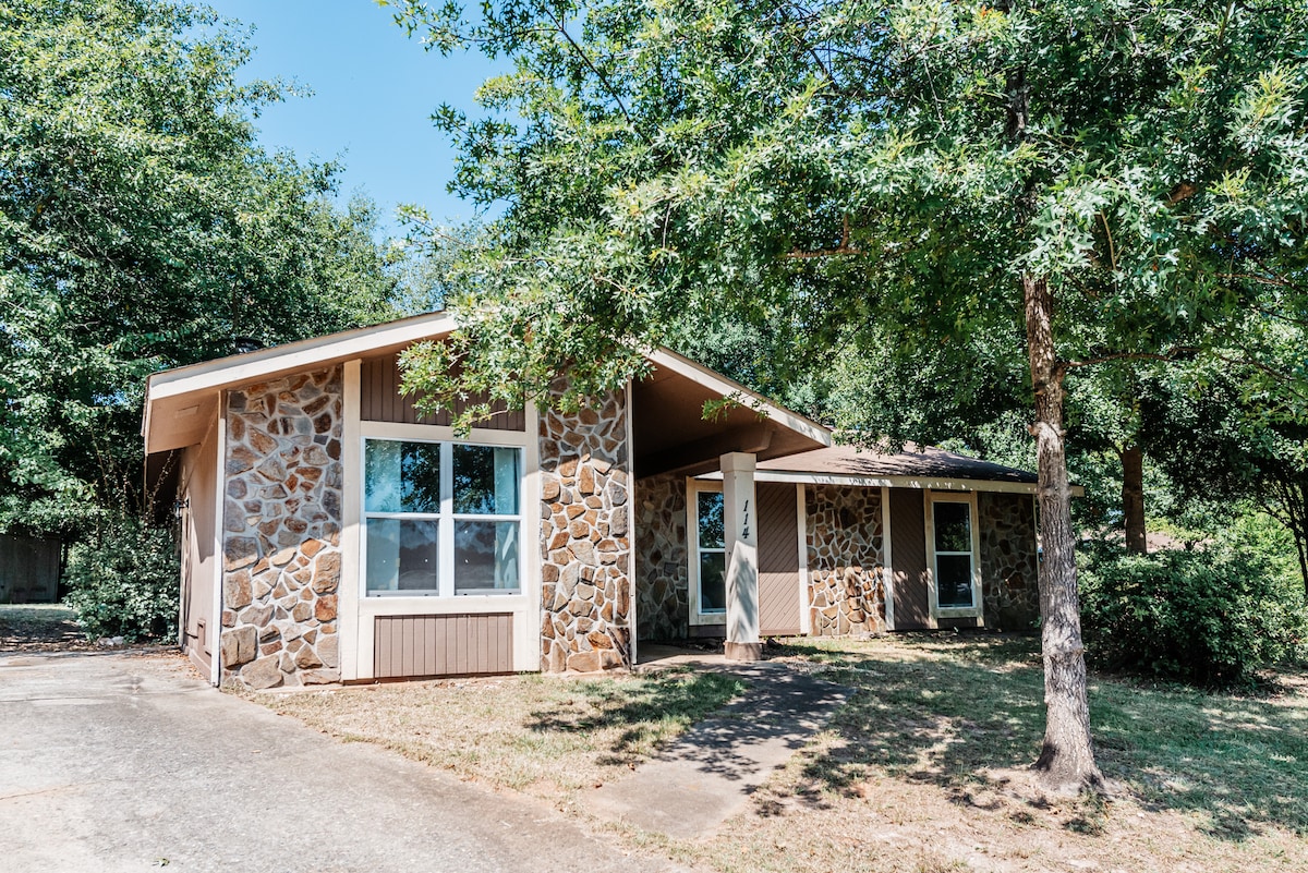 Nestled in the heart of town, our Historic Macon Lodge has everything you need to relax and feel like you have escaped into nature. 3 bedrooms, 2.5 bathrooms, with 2 stone fireplaces and large glass windows. There is a spacious backyard with a fire pit and breathtaking wooded walking trails to a nearby historic Grotto. This Lodge is perfect for romantic couples and families with small children. There will be no parties, groups or gatherings allowed. Please acknowledge in your message