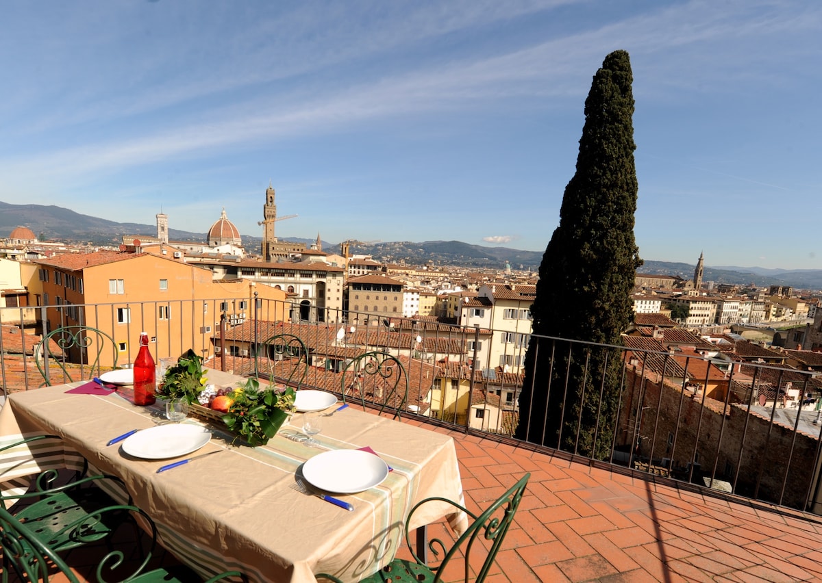 Studio drăguț și liniștit la câțiva pași de Catedrala din Florența. 2 etaje cu lift. Terasa sa frumoasă și spațioasă te va lăsa fără suflare, cu priveliștea magnifică a Domului Domului. Terasa este echipată și plină de plante pentru a te relaxa în pace cu un pahar de vin după o zi lungă pe străzile din Florența. În interior vei găsi un spațiu deschis frumos, cu bucătărie, pat dublu, TV inteligent, aer condiționat și o baie cu duș.
