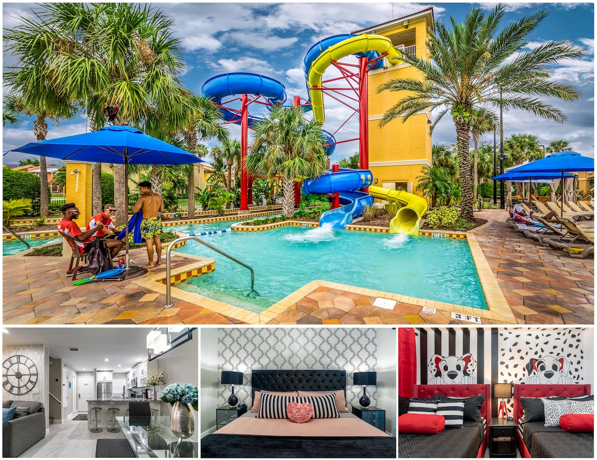 Discover our charming Dalmatian House at Fantasy World Villas, minutes from Disney, Universal & Sea World. This modern 2-bed villa features a 101 Dalmatians themed room, king-size bed in the master, full kitchen, laundry, private patio, free Wi-Fi & parking. Enjoy resort amenities: heated pools, hot tubs, lazy river, water slides, tiki bar, gym, playground, sports courts, and more. Walk to restaurants & find grocery stores nearby. Experience a magical stay in this captivating retreat! Book Now!