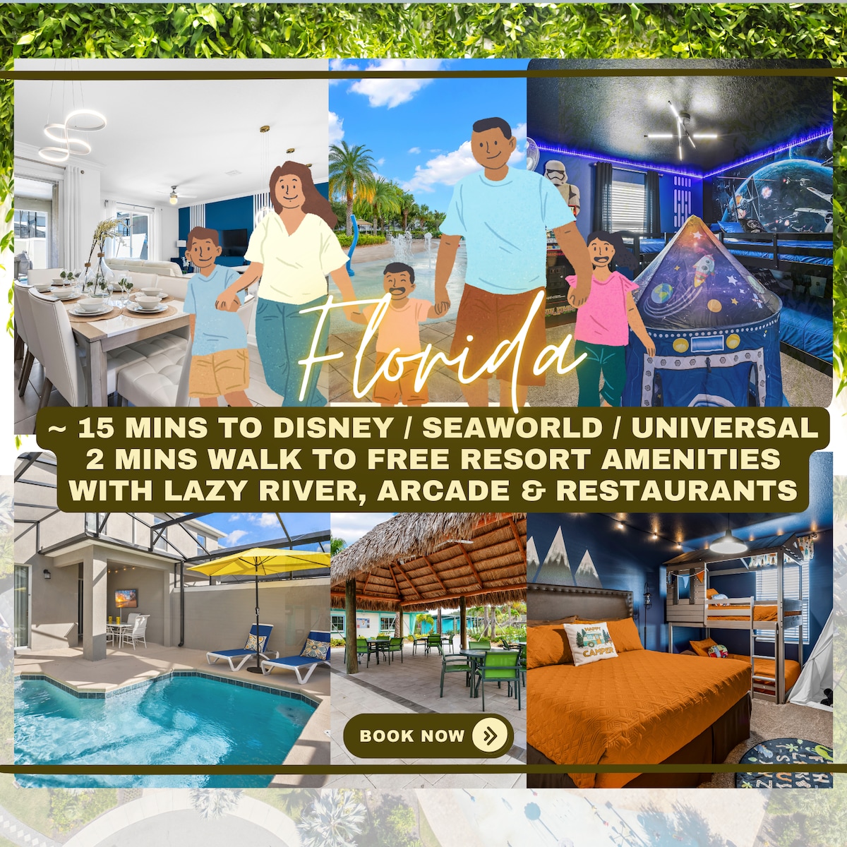 Bine ai venit la cea mai bună escapadă de familie în apropiere de Disney! Acest apartament spațios cu 3 dormitoare este situat perfect la doar câteva minute de magia Disney. Conceput cu gândul la familii, are două dormitoare pentru copii cu tematică frumoasă: o aventură cu povești de jucărie și o evadare tropicală inspirată de Moana, garantată pentru a-i încânta pe cei mici. Bucură-te de acces deplin la un parc acvatic uimitor, inclus gratuit, făcând fiecare zi să te simți ca o vacanță. Indiferent dacă te relaxezi după o zi în parcuri sau te stropești