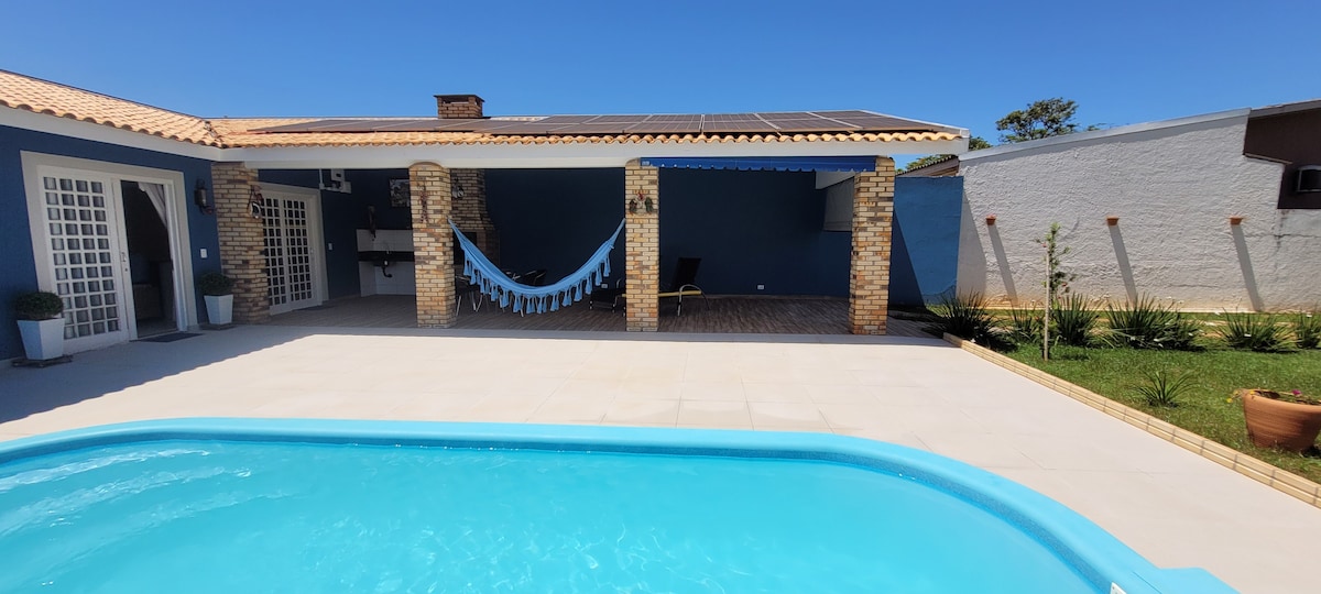Leve toda a família a este ótimo lugar com muito espaço para seu momento de descanso e laser. Ambiente com 4 suítes e 1 banheiro externo, 4 suítes com ar- condicionado , sala de estar, sala de jantar, edícula com churrasqueira, pia, piscina, cozinha completa incluindo geladeira, micro-ondas, forno elétrico, liquidificador, sanduicheira e utensílios necessário. Garagem coberta para 1 carros e espaço aberto para mais 3. OBS: piscina não possui aquecedor e nossos valores são por pessoa.