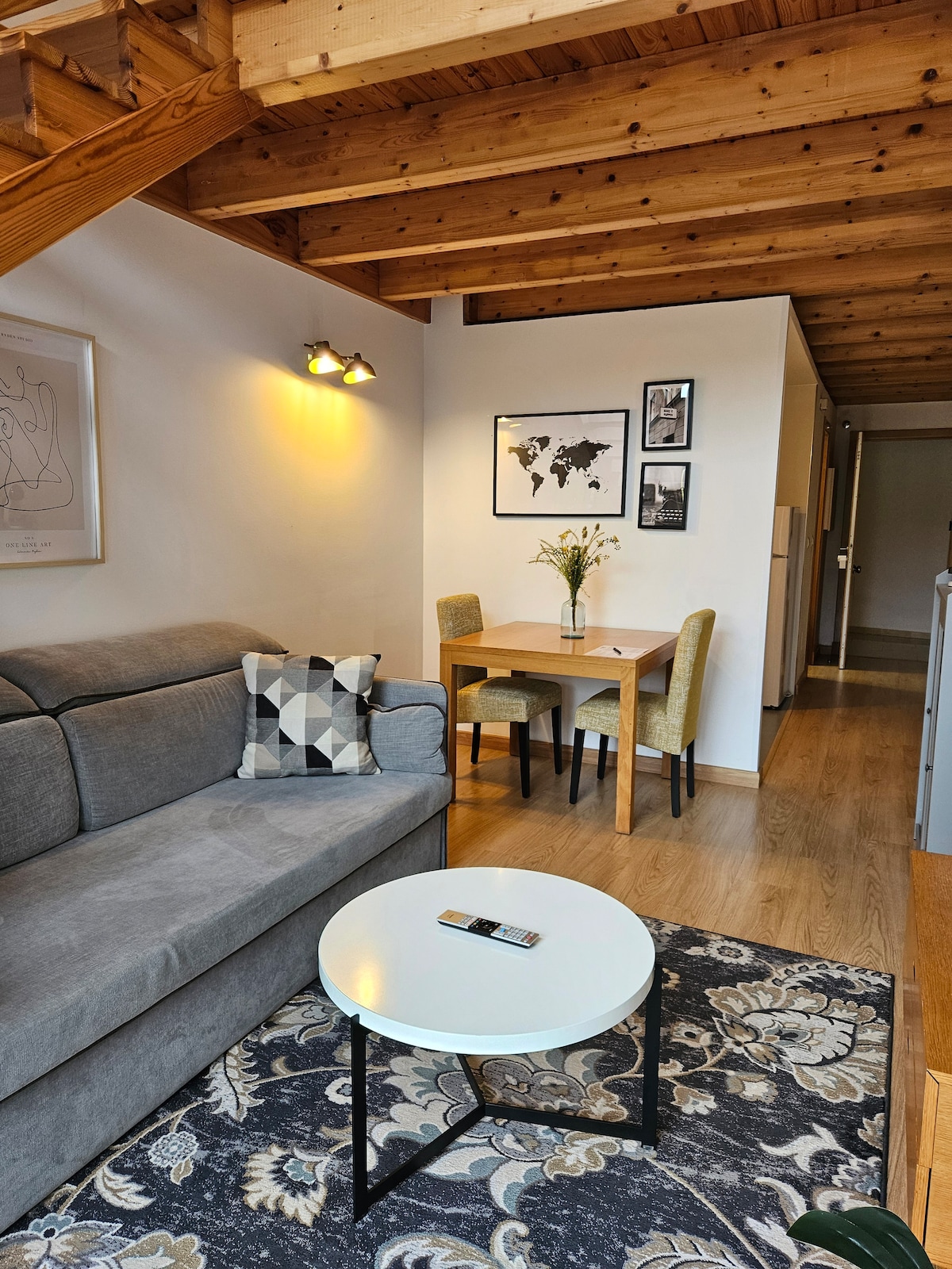 Loft în Milladoiro, două înălțimi, la 3 km de Santiago de Compostela. Acces la autostradă într-un minut. Mercadona, benzinărie, restaurante la ușă. Spital clinic la 2 kilometri distanță. În jumătate de oră vei fi pe plajele din Noia, în 45 de minute în Sanxenxo, Ribeira, Finisterre etc. Bucătărie completă, baie cu duș, pat de 160 cm și canapea extensibilă de 150 cm. Parcare inclusă în aceeași clădire. Maximum 4 oaspeți. Datorită ferestrelor mari, nu există întuneric absolut în canapeaua extensibilă în zori.