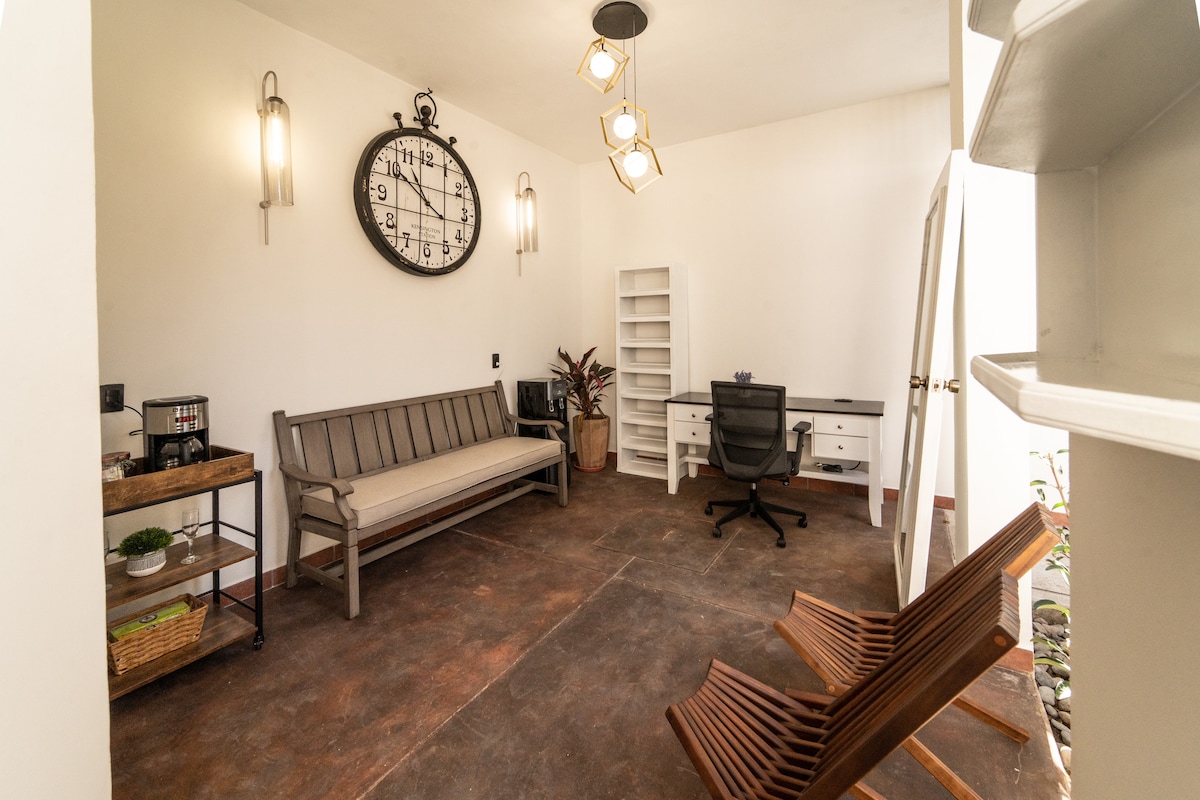 În acest loft poți avea cazări la serviciu sau în vacanță. Ai o grădină foarte frumoasă, cu un leagăn de citit, o cadă cu hidromasaj pentru relaxare, toaletă dublă în cazul în care vii sunt prieteni sau partenerul tău, o zonă de lucru super spațioasă și un scaun confortabil pentru a te uita la televizor. În plus, poți folosi dulapul spațios pentru a te pregăti pentru o petrecere sau un eveniment. Acest loc elegant și liniștit din Bugambilias, Zapopan, se află la 5 minute de mai multe piețe comerciale din Lopez Mateos.