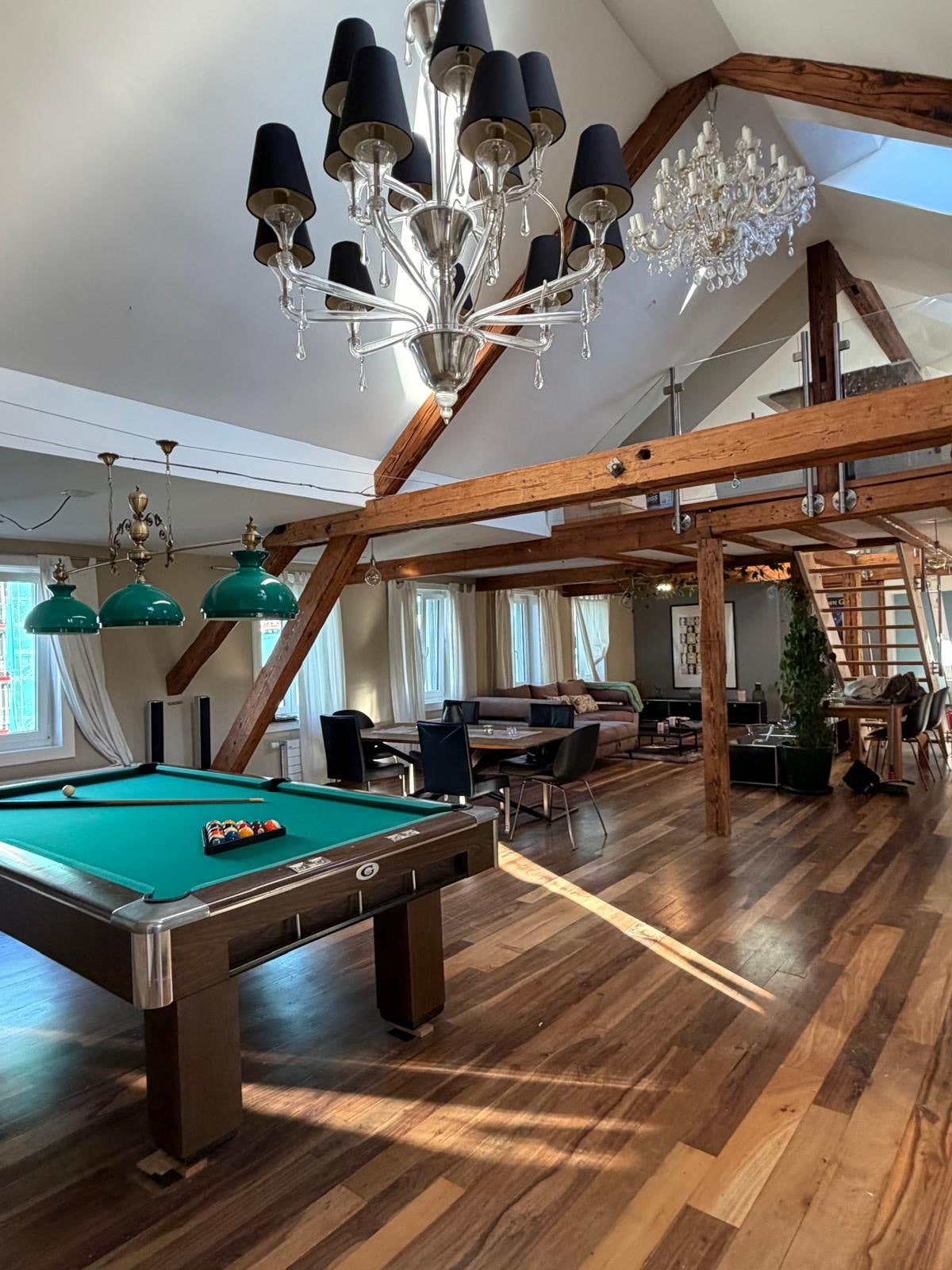 Bucură-te de acest apartament liniștit și elegant, în cea mai centrală locație din sat, la un minut de mers pe jos de stația de autobuz. De acolo, poți ajunge rapid la Winterthur, Frauenfeld sau Zurich cu autobuzul și S-Bahn. Apartamentul de la mansardă este nou și extins cu materiale de înaltă calitate. Designul interior este la modă și în cea mai mare parte din lemn, țesătură sau piele. Există o parcare subterană disponibilă. Există o stație de încărcare pentru biciclete electrice.