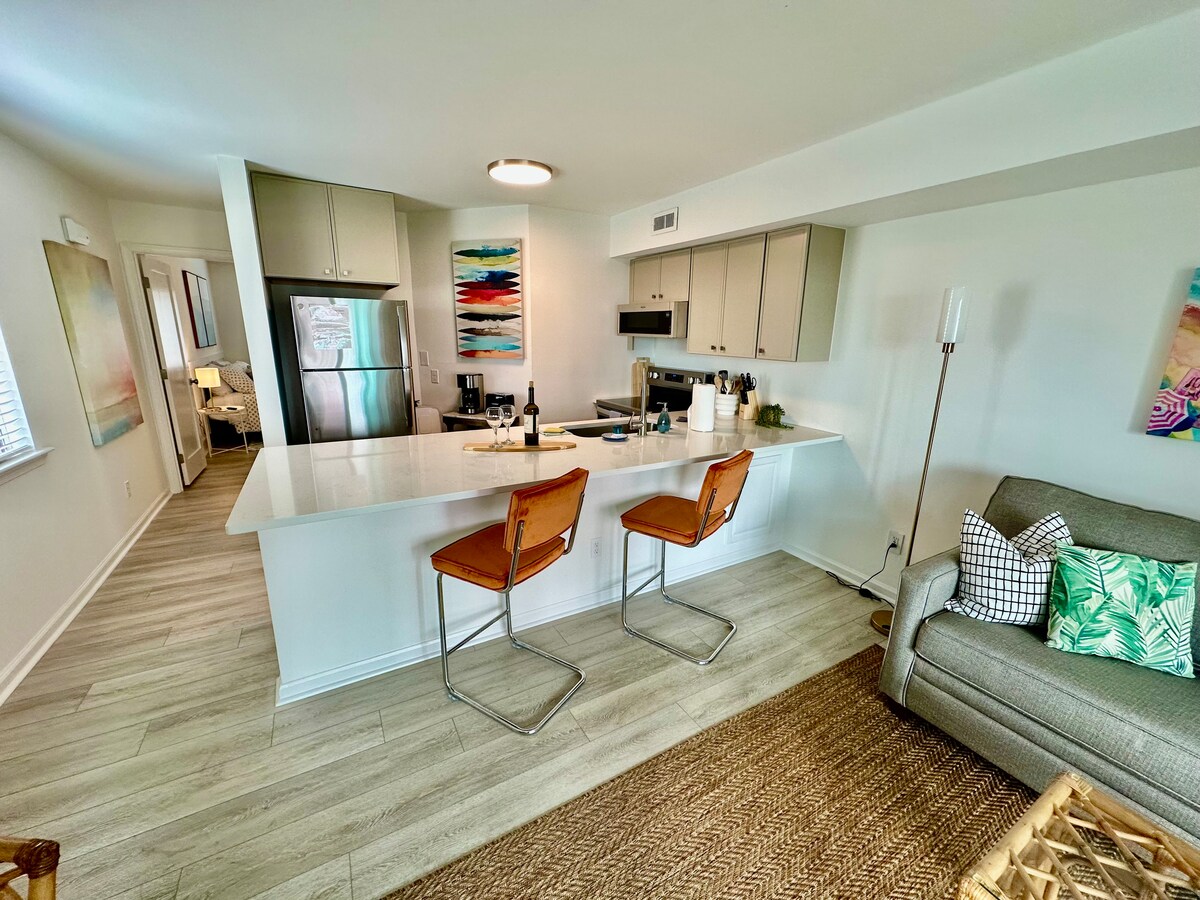 My team hosts with the most, and we want to make your stay is perfection! This space is absolutely perfect for a couple and 1 maybe 2 more when needed. With ocean and canal views in the heart of Carolina Beach this little gem comes with a full service kitchen, a nice sized bathtub, and a king size bed! The ottoman in the living area converts to a comfortable twin size bed. Beach access being just a few steps away. 5 minute walk to the CB boardwalk.