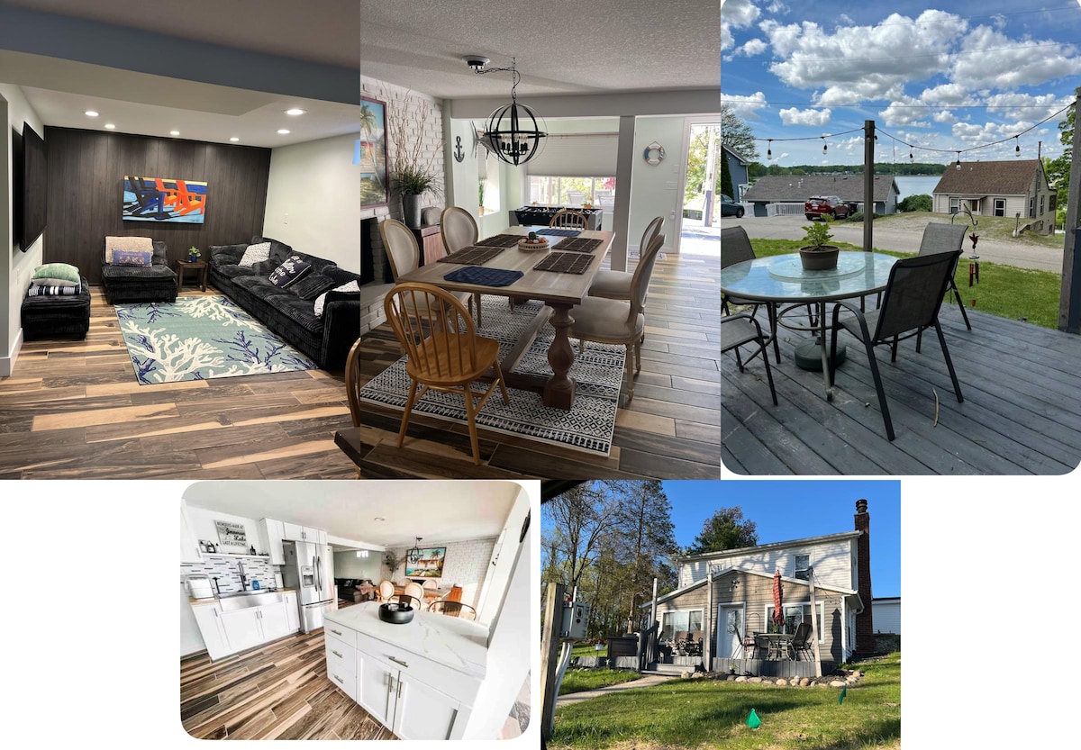Beautifully renovated modern cottage. All appliances and furniture are brand new. Space on the dock for your boat! Plenty of room for beach activities and yard games. Plenty of parking. There is an extra refrigerator in the garage and there are chairs and toys for quest use.