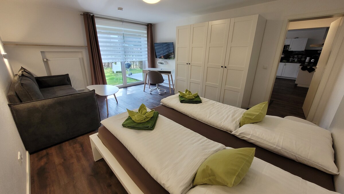 BayVista, the Bayerwald Lodge. Ten modern, comfortable holiday apartments with a panoramic terrace, lounge, fitness room and wellness area with Finnish sauna and infrared cabin. Large garden with plenty of space to chill, play, grill... You live in a 39 sqm 2-room apartment with balcony, mountain view and private shower room. In the living/dining room there is a chic IKEA pull-out sofa bed and a dining table for four. Your own corner kitchen with dishwasher makes you independent.