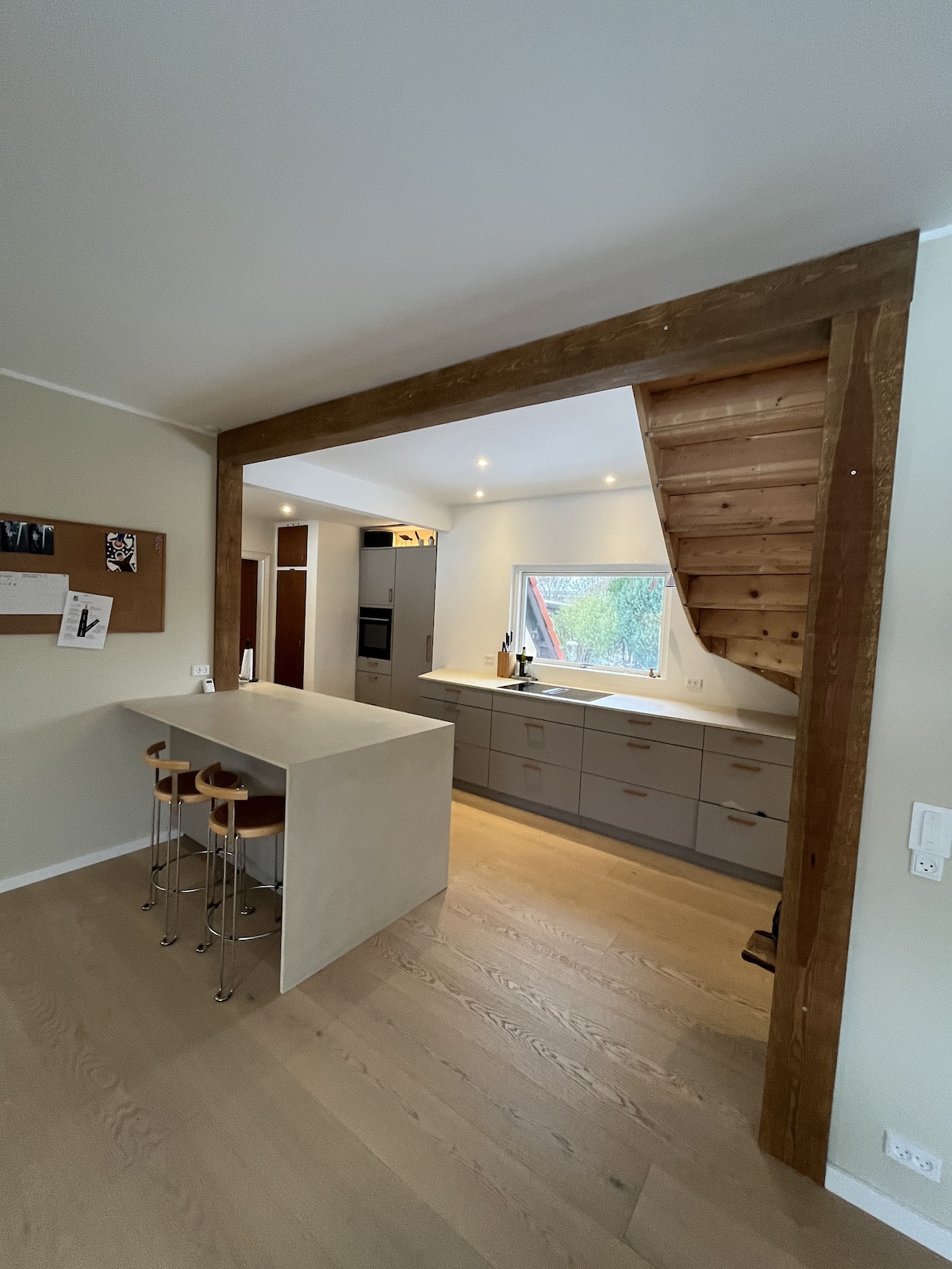 În zona pitorească, aproape de S-tren, parcare proprie, bucătărie nouă, baie m mașină de spălat și living/sufragerie. Apartamentul este de aproximativ 100 m2, cu un living confortabil/sufragerie cu aragaz pe lemne. 2 camere la etaj. Apartamentul este o locuință chiriașă, aparținând unei ferme cu 4 lungimi. Apartamentul nu poate fi închiriat pe termen lung.