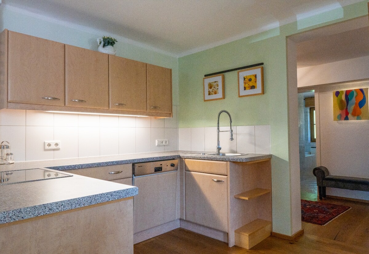 Apartament modern, elegant, cu două camere, într-o locație excelentă Finalizat în 2021, apartamentul cu un dormitor impresionează prin arhitectura sa și mobilierul de înaltă calitate. Acesta este situat la etajul 1 al unei case unifamiliale construită în 2020 și locuită chiar de proprietari, într-o zonă rezidențială liniștită, la 5 minute de mers pe jos de centrul istoric al Mondsee.
