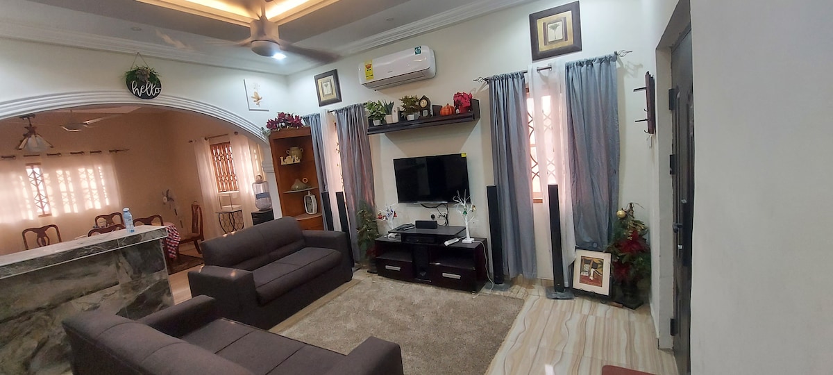 Primire călduroasă în spațiul nostru vibrant! Suntem o familie, înrădăcinată atât în Ghana, cât și în Olanda, oferindu-ți o felie din casa noastră diversă, încrucișată. Descoperă farmecul autentic al orașului Accra stând la duplexul nostru nou construit din Ablekuma, la doar 30 de minute de aeroport. Această bijuterie locală este securizată, centrală și accesibilă – poarta ta de acces către Osu, Labadi Beach, Black Star Square și multe altele! Te vei cufunda în stilul de viață ghanez autentic și în cultura bogată. Îmbogățește-ți călătoria în Ghana la tarife accesibile!