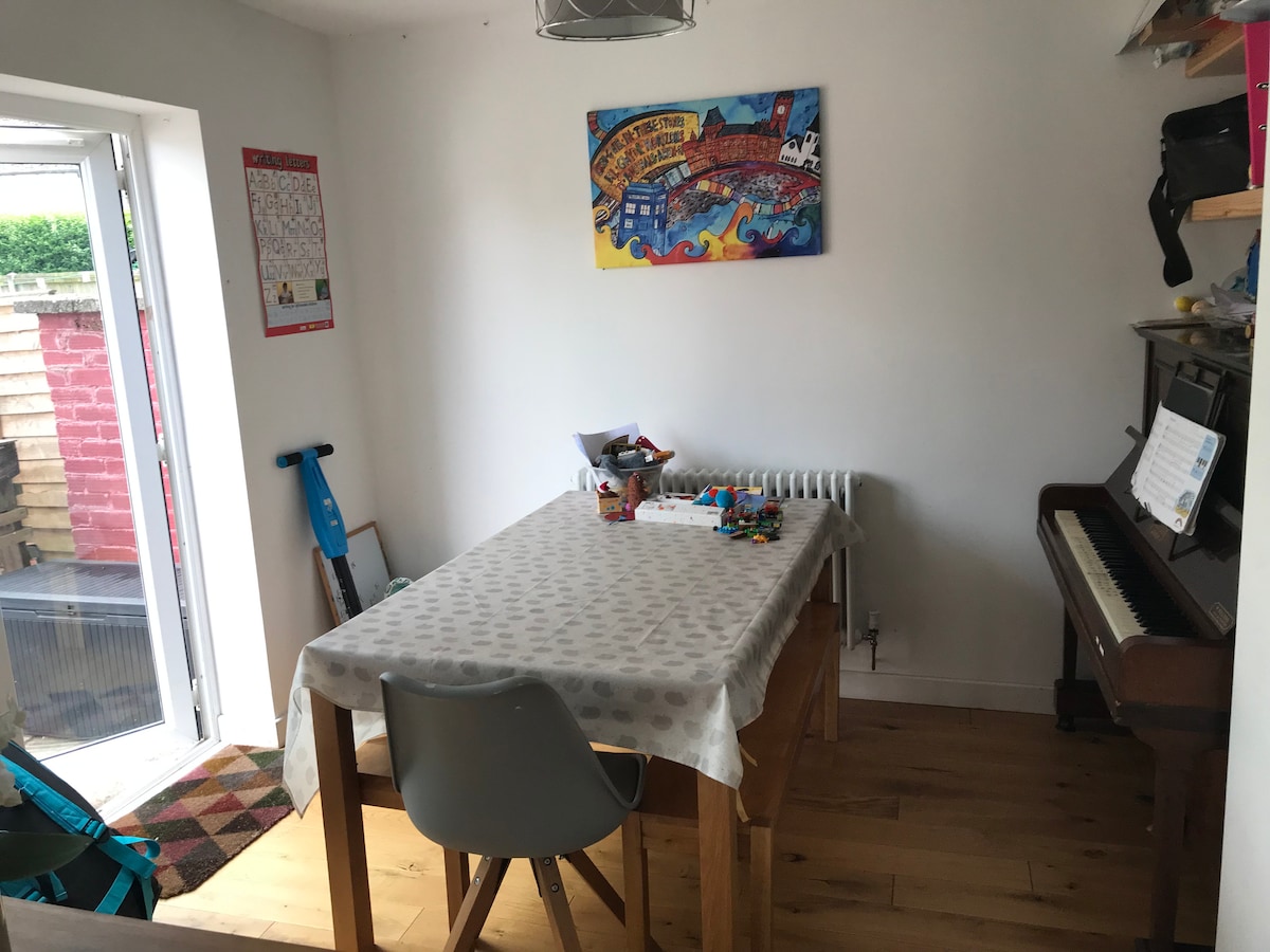 Spațiu privat confortabil la doar 10 minute de Cardiff Central. Bucură-te de propria intrare, parcare gratuită, baie privată și o zonă mică de bucătărie cu chiuvetă, cuptor cu microunde, cuptor cu grătar, fierbător de apă, prăjitor de pâine. Include TV, Wi-Fi, uscător de păr, călcat. Mergi pe jos până la stațiile de autobuz/tren și supermarketuri, cum ar fi Lidl, Aldi, Tesco. Ideal pentru șederi de scurtă durată sau călătorii de afaceri. Te rugăm să păstrezi camera ordonată și curată în timpul șederii. Dacă ai nevoie de ceva în timpul șederii, te rugăm să ne anunți că vom face tot posibilul pentru a te ajuta. O bază perfectă pentru a explora Cardiff!