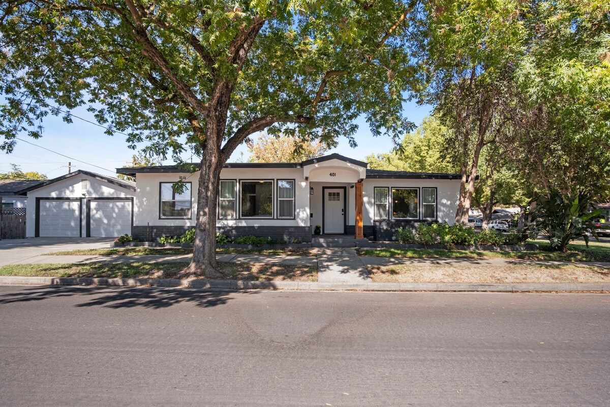 Bine ai venit la refugiul tău de lux din centrul orașului Modesto! Această locuință modernă 2BR/1,5BA complet remodelată oferă: • 1.150 mp de casă elegantă cu două etaje, cu spațiu de locuit spațios, cu bucătărie și băi noi • Curte mare cu iarbă căptușită, lumini Edison și vatră • Smart TV de 65”, WiFi 1200mbps, sistem de securitate 4K și garaj inteligent • Pat matrimonial cu birou, plus două paturi twin, toate cu lenjerie de pat premium • Distanță de mers pe jos până la restaurante rafinate, viață de noapte și atracții