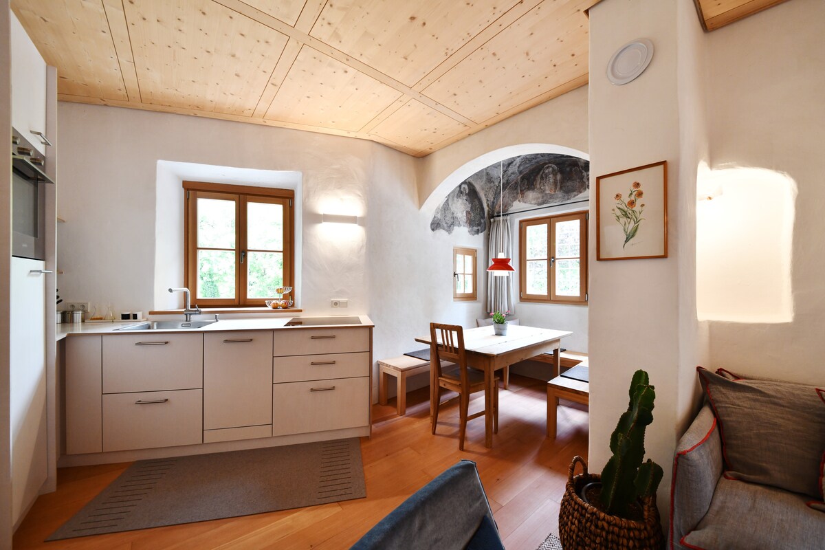 Paterwohnung din Kaltern, situat în cartierul Oberplanitzing, este o clădire istorică și fosta bază sudică a mănăstirii Tegernsee. Situat la primul etaj, există încă note arhitecturale în apartamentul Tatălui, cum ar fi cascada barocă cu sfântul patron al lacului Tegernsee, St. Quirinus. Ușile vechi din lemn, podelele care scârțâie și stucul de pe pereți adaugă fler istoric, în timp ce noua baie și mobilierul oferă confort.