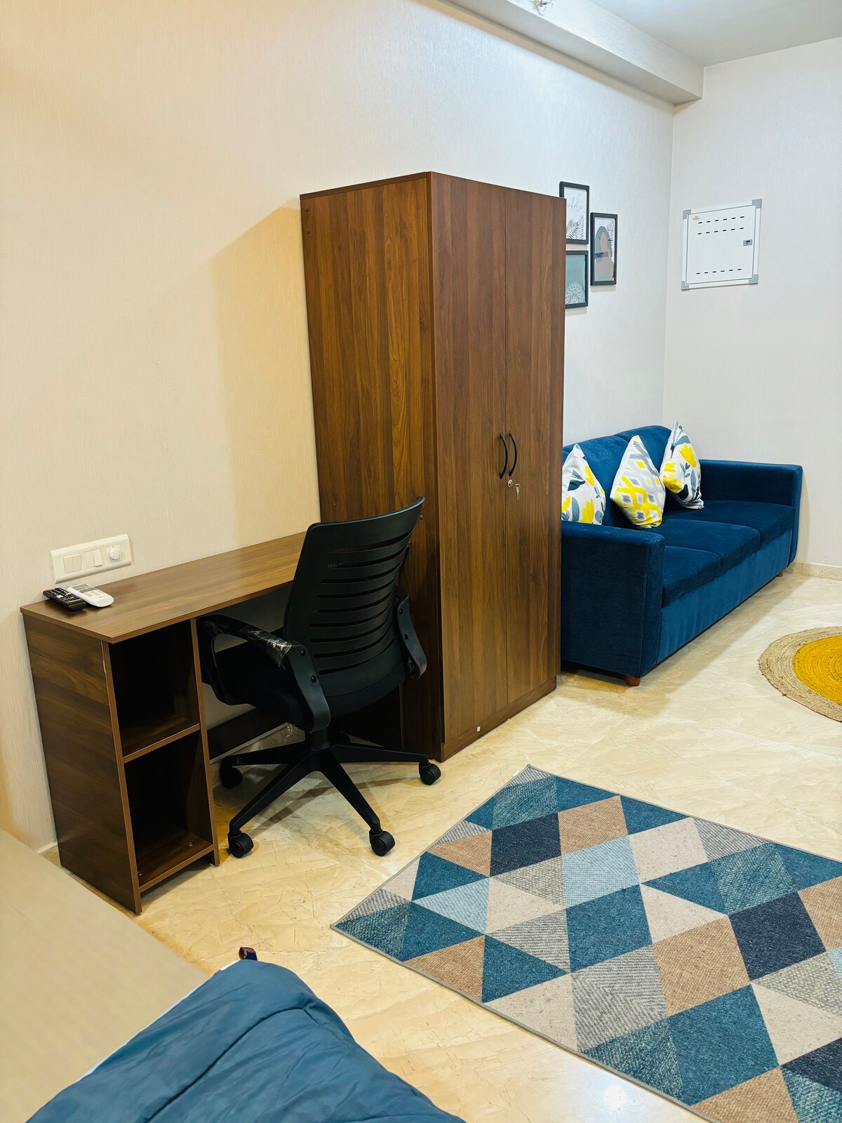 Bine ai venit într-un apartament studio elegant în formă de L, situat la un etaj superior în Hiranandani Estate, oferind priveliști frumoase și multă lumină naturală. Proiectat cu confort și estetică în minte, spațiul se simte aerisit, modern și atent amenajat - perfect atât pentru șederi scurte, cât și pentru șederi lungi. Studioul include: • O zonă de dormit confortabilă pentru 2–3 oaspeți • Un spațiu dedicat pentru luat masa/lucru de acasă • O bucătărie complet utilată cu ustensile de gătit și articole esențiale • Mașină de spălat