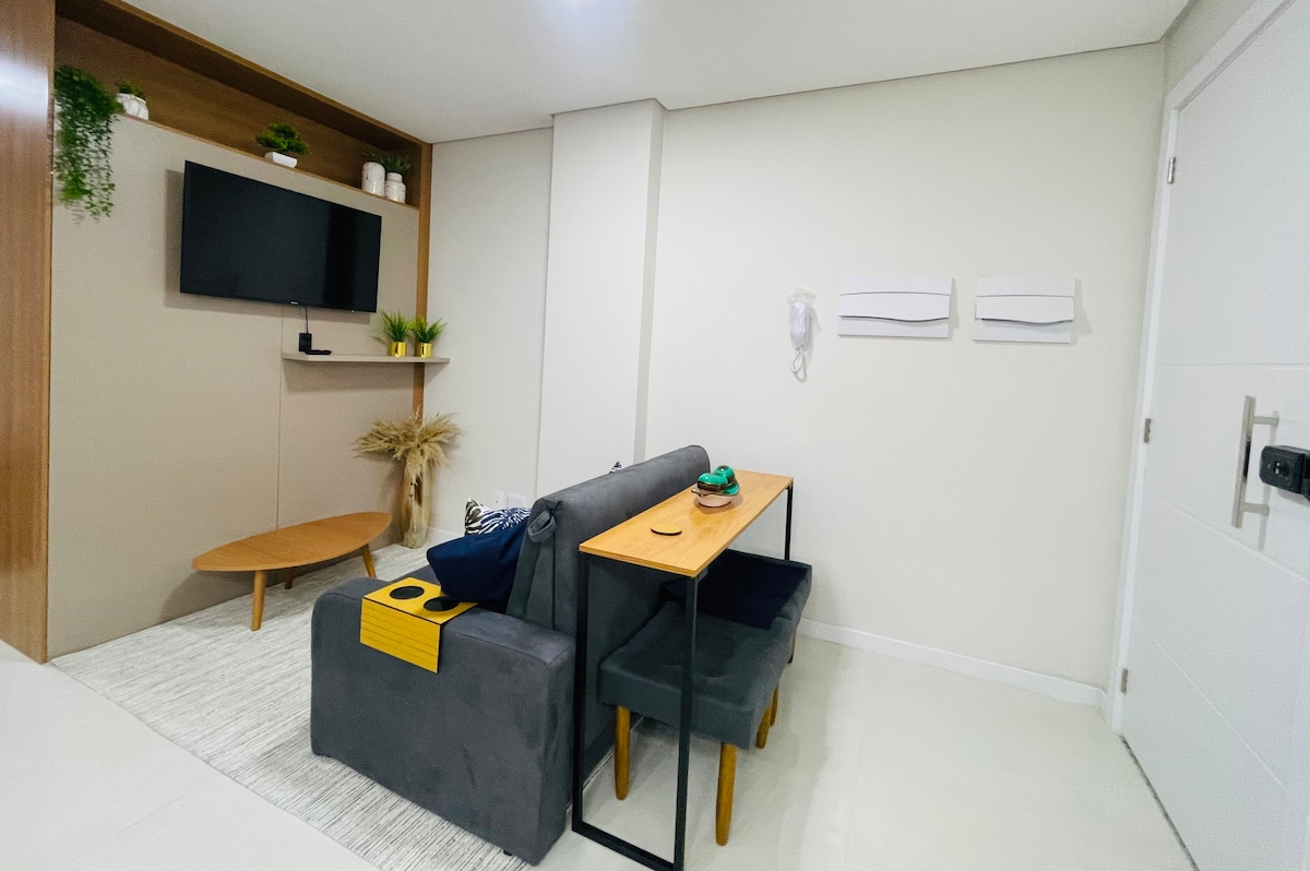 Reîncarcă-ți energiile în Imbituba la Studio Alma da Vila. Cu o vedere frumoasă la Vila Beach, iluminată de soarele după-amiezii și decorată cu fraze inspirate, studioul oferă o atmosferă înălțătoare și primitoare. Bucură-te de apusul soarelui în confortul apartamentului și bucură-te de facilitățile clădirii – piscină infinită încălzită pe terasă, sală de gimnastică, solar, sală de jocuri, spălătorie și coworking – pentru o ședere axată pe bunăstarea, caracterul practic și inspirația vizuală.
