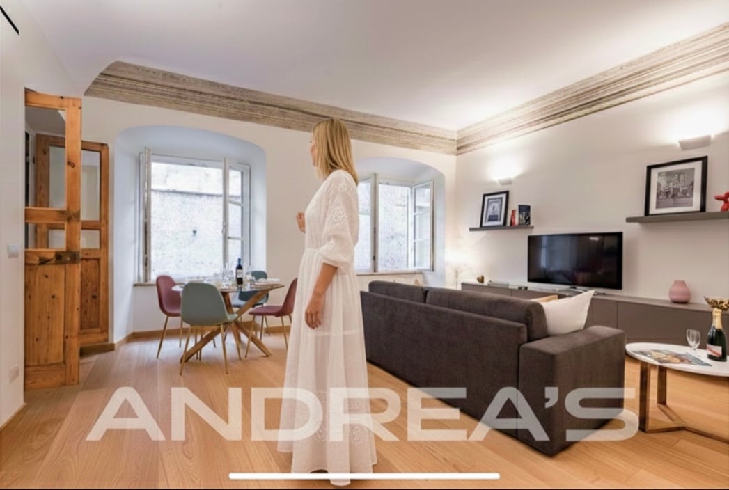 Apartament elegant și luminos Cu vedere la Piața Matteotti centrală Vizavi de renumitul Palazzo Ducale Compus din: -1 living spațios deschis deosebit cu canapea extensibilă confortabilă și tavan înalt cu frescă -1 zonă de luat masa elegantă cu masă de designer și scaune -1 bucătărie modernă cu tot confortul -1 dormitor dublu situat la mezanin cu vedere la living iluminată, de asemenea, de cele 3 ferestre maiestuoase -1 baie modernă dotată cu duș din sticlă