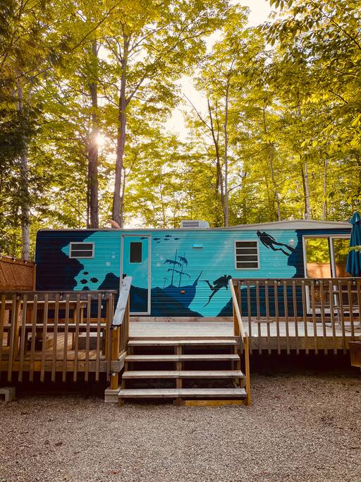Remorcă frumoasă curată de 40 ft, zonă privată. Numai pentru uz exterior, vă rugăm. O cameră are paturi supraetajate. O singură parte superioară, fund dublu mic. Te rugăm să aduci propriile lenjerie de pat/sac de dormit/prosoape. Animalele de companie nu sunt acceptate, zonă fără alergii. Șemineu electric,vatră, zonă frumoasă pentru plimbare. Câteva minute de condus până la The Kee! Torrance Barrens 18 minute. Cea mai apropiată plajă Jaspen Beach, la câteva minute de mers cu mașina. Consultă ghidul meu pentru locuri minunate de vizitat în apropiere cu mașina. Cafea/ceai,smântână/lapte/zahăr și brioșe, salată de fructe