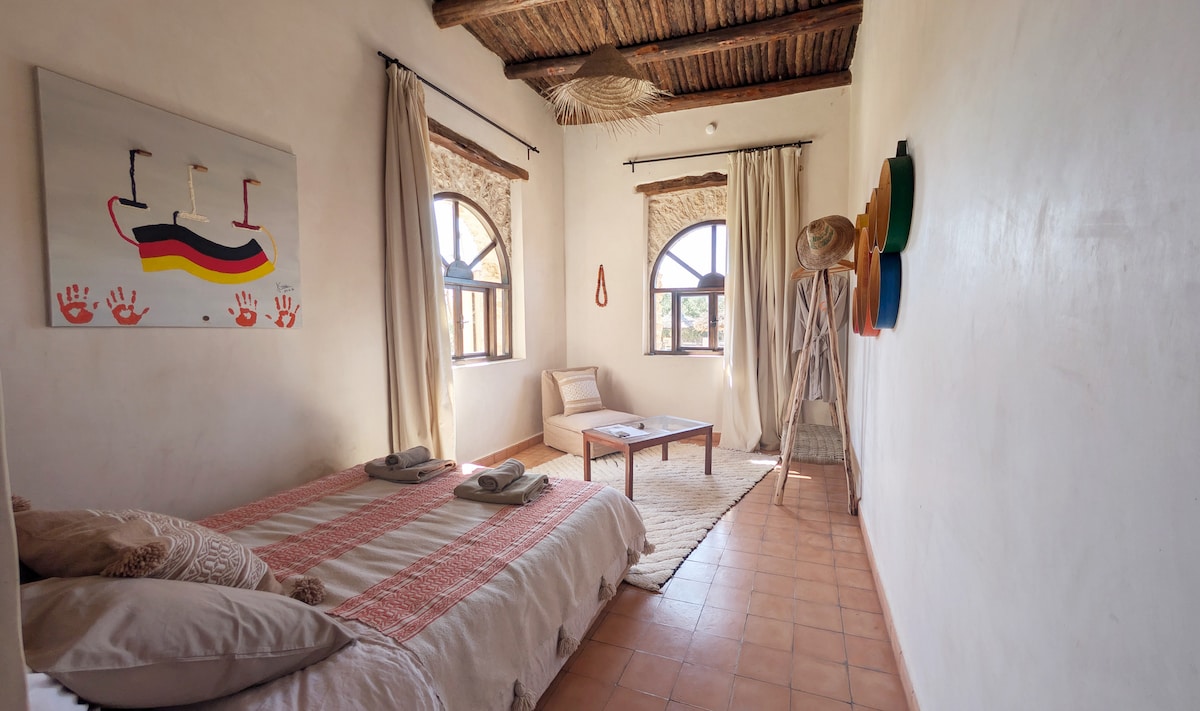 Twin (2 single) sau 1 pat king-size - (te rugăm să ne spui care este preferința ta) într-o casă din piatră tradițională marocană, cu o atmosferă fermecătoare de casă pentru cei care doresc să scape de tot și să se relaxeze. Amplasat într-o zonă rurală liniștită, la 800 m de satul Sidi Kaouki. Grădină sălbatică cu yoga shala și teren de boules pentru cei care doresc să se bucure de aer liber. Confortabil, confortabil, cu cărți și jocuri pentru nopți liniștite în. Wi-Fi în întreaga locuință. Piscină în aer liber - neîncălzită. Mic dejun și curățenie incluse.