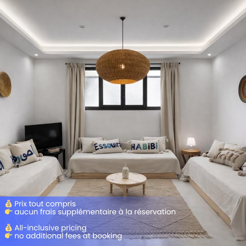 En plein cœur de la Médina historique, proche du port et à peine quelques minutes à pied de la belle plage d’Essaouira. Vous pourrez vous ressourcer en famille en profitant de la douceur de vivre d'Essaouira. Le riad vient d’être entièrement refait avec des matériaux traditionnels et décoré avec soin dans un style moderne et confortable.Tous les équipements sont neufs y compris la literie. Cuisinière à disposition pour préparer vos petits déjeuners et de nombreux plats en option.