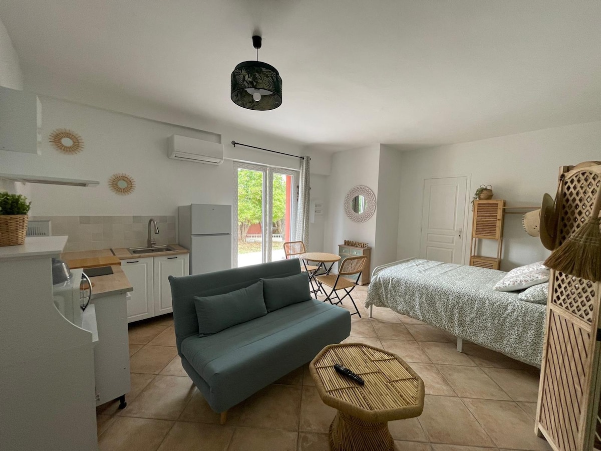 Apartament frumos, independent și cu aer condiționat, cu două camere, situat la 10 minute de mare, într-o zonă liniștită și aproape de toate facilitățile, cu grădină privată și fără a fi vizibil din exterior. (Fibră) Acesta include un living, o bucătărie echipată, un dormitor separat (pat matrimonial 160/200 cm), un duș cu WC. Vei putea parca vehiculul în fața intrării. Vei fi aproape de mare, de calanques , Marsilia și Aix en Provence (la 20 de minute de stația TGV Aix en Provence și aeroportul Marignane)