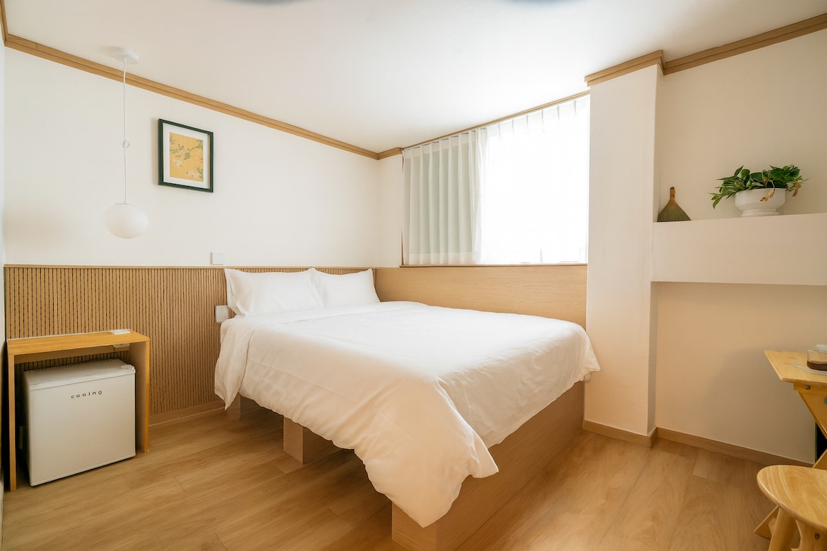 Stay105 Haenggung Această cazare este o cazare independentă, la un preț rezonabil. Mai degrabă decât cei care se așteaptă la servicii complete de clasă hotelieră Este potrivit pentru cei care doresc o ședere curată și liniștită. Este o cazare confortabilă în Haenggung-dong Winter Alley.” - Instrucțiuni pentru cameră Pat dublu confortabil și lenjerie de pat albă de clasă hotelieră TV montat pe perete, aer condiționat, baie curată Umerașe și rafturi pentru a depozita lucruri simple Un spațiu emoțional completat cu iluminare moale și o mini-masă - Farmecul spațiului O cameră liniștită unde te poți bucura de o ceașcă de cafea sub soare Un spațiu care îți calmează mintea cu un interior cald și calm Dimensiune și structură bună pentru a sta singur sau cu două persoane - Locație 5 minute de mers pe jos de Palatul Hwaseong Haenggung din Suwon, Aproape de Haenggung-dong Cafe Street, Traditional Market și Workshop Street Te poți bucura de o călătorie relaxantă chiar și în oraș. Stay105 Haenggung Fă-ți timp să te odihnești și să-ți reîncarci simțurile.
