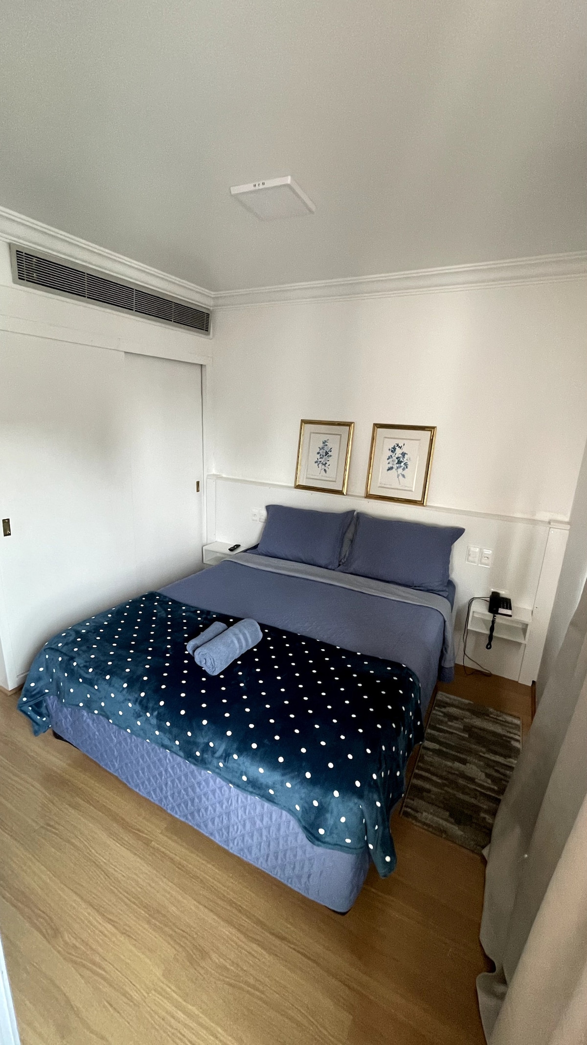 Flat de 1 quarto e ante sala, confortável com ótima localização com duas camas: opção de duas camas de solteiro que juntas se torna uma cama King. O sofá cama é para reserva com 3º hóspede. Oferecemos roupa de cama, toalhas e mantas. Limpeza diária, recepção 24 horas, estacionamento gratuito, academia, sauna, piscina. Restaurante no prédio (custo extra). Local super seguro/rua tranquila. Próximo ao Parque/Ginásio Ibirapuera, supermercado, farmácia, restaurantes, clínicas. 1km da Paulista