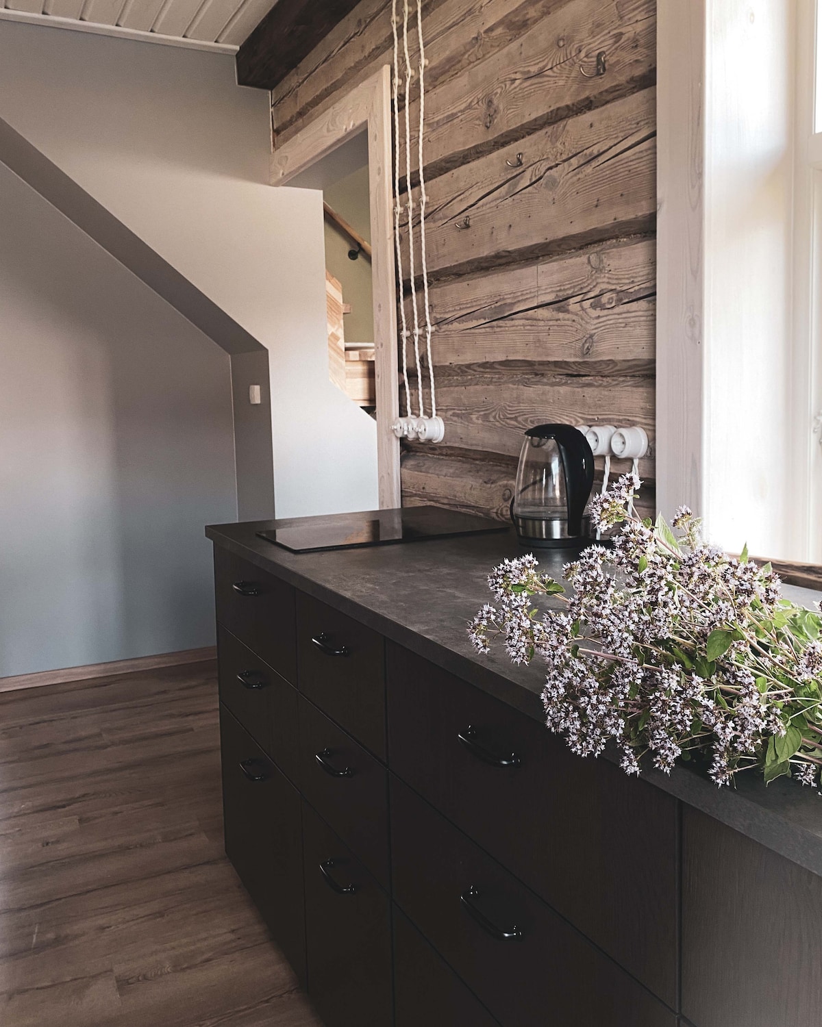 Acest loc unic are un stil propriu. Această garsonieră a fost proiectată pentru vacanțe creative sau vacanțe boeme. Priveliștea de la ferestrele studioului este uimitoare. Poți vedea pădurea Labanoras și râul Zeimena. De asemenea, devine magic să vezi timpul trecând trenurile prin ferestrele tale, deoarece casa se află între două căi ferate. La câteva sute de metri, poți ajunge să ai o cărări adorabile, care se află într-o zonă de mlaștină a râului.