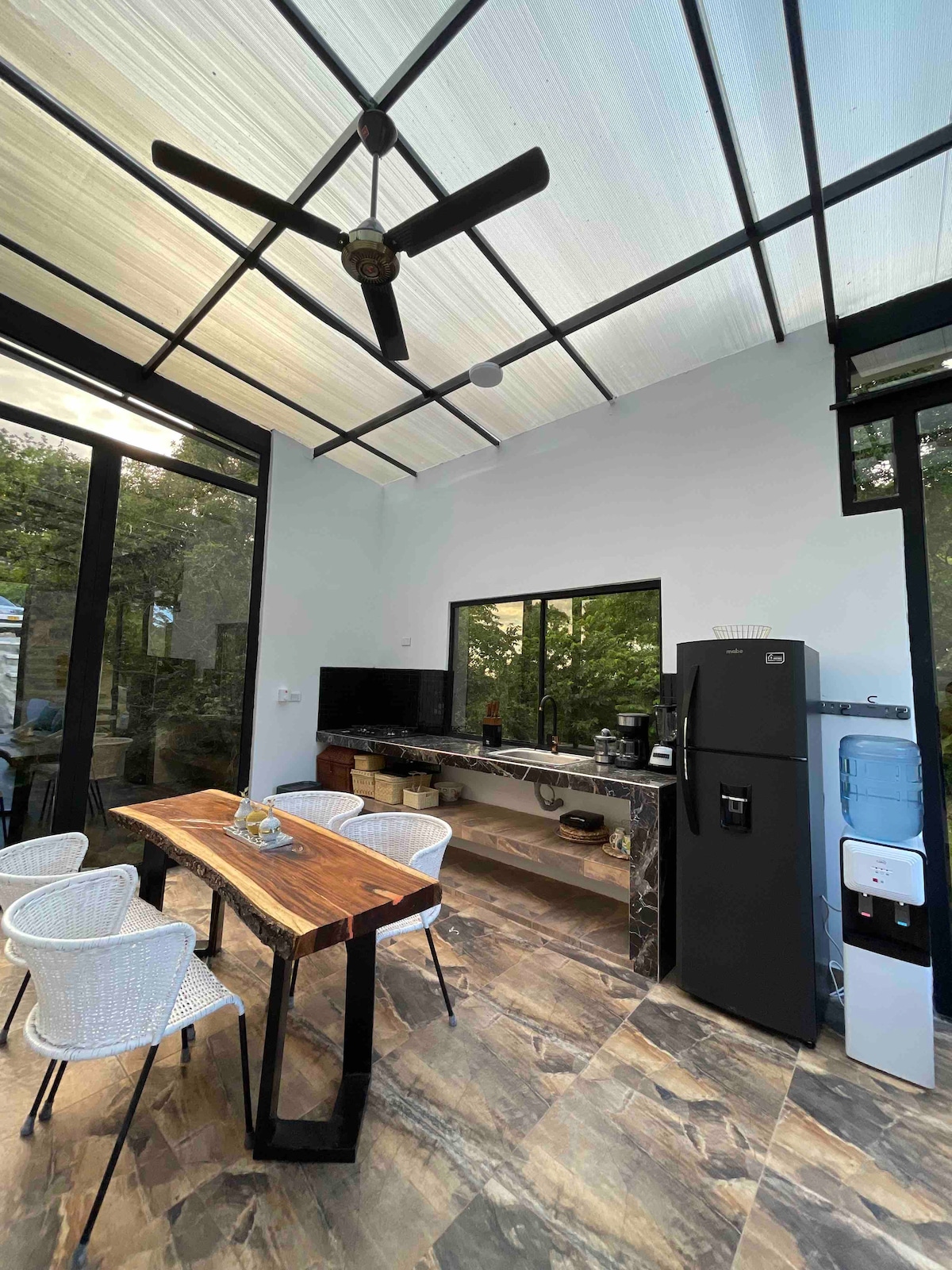 Evadează în refugiul tău privat de la țară din San Marcos Poblado, Ricaurte. Locul perfect pentru familii sau grupuri de prieteni responsabili care doresc să se relaxeze, să se deconecteze și să creeze amintiri într-un cadru natural excepțional. Zilele tale se vor învârti în jurul piscinei private, situată strategic pentru a profita de razele soarelui și cu o temperatură ideală zi și noapte. Zona de grătar, la doar câțiva pași de piscină. Mobilierul confortabil și un hamac creează locul perfect pentru a-l împărți.