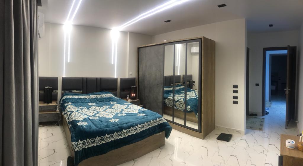 A private apartment in the most prestigious areas of the Fifth Settlement in New Cairo, a full bedroom, a large bed, a wardrobe, a reception, an American kitchen, a bathroom, the apartment is covered with Wi-Fi, and it has a private garden with a large grill and an umbrella, and the apartment is in a privileged location with easy access to any area within Cairo
