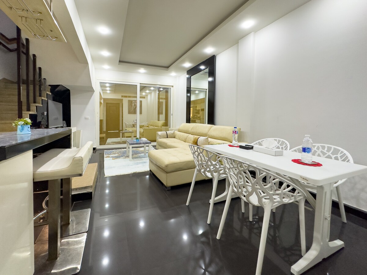 Bine ai venit la evadarea ta elegantă din New Cairo! Această casă înșiruită nou-nouță, cu 5 dormitoare, îmbină designul modern cu detalii calde, făcând-o perfectă pentru familii, grupuri sau călători de afaceri care caută confort și stil. Cu spațiu pentru până la 12 oaspeți, te vei bucura de intimitate, confort și finisaje premium într-unul dintre cele mai căutate cartiere din Cairo.