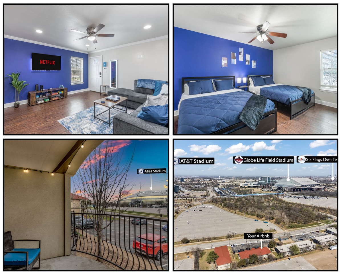 Bucură-te de confort de lux și de priveliști uimitoare ale stadionului în acest apartament elegant cu 2 dormitoare/3 paturi/2 băi, la doar câțiva pași de Stadionul AT&T, Globe Life Field și Texas Live! Vatra de foc, grătarul, o bucătărie modernă, televizoarele inteligente și parcarea gratuită îl fac perfect pentru familii, cupluri, persoane care călătoresc în interes de afaceri și grupuri. Creează amintiri de neuitat! - Câteva minute de mers pe jos până la jocuri și concerte - La mai puțin de 5 minute de mers cu mașina de Six Flags și Hurricane Harbor - Aproape de restaurante grozave, cum ar fi Texas Live! și Cane Rosso - Parcare gratuită + acces facil la Uber