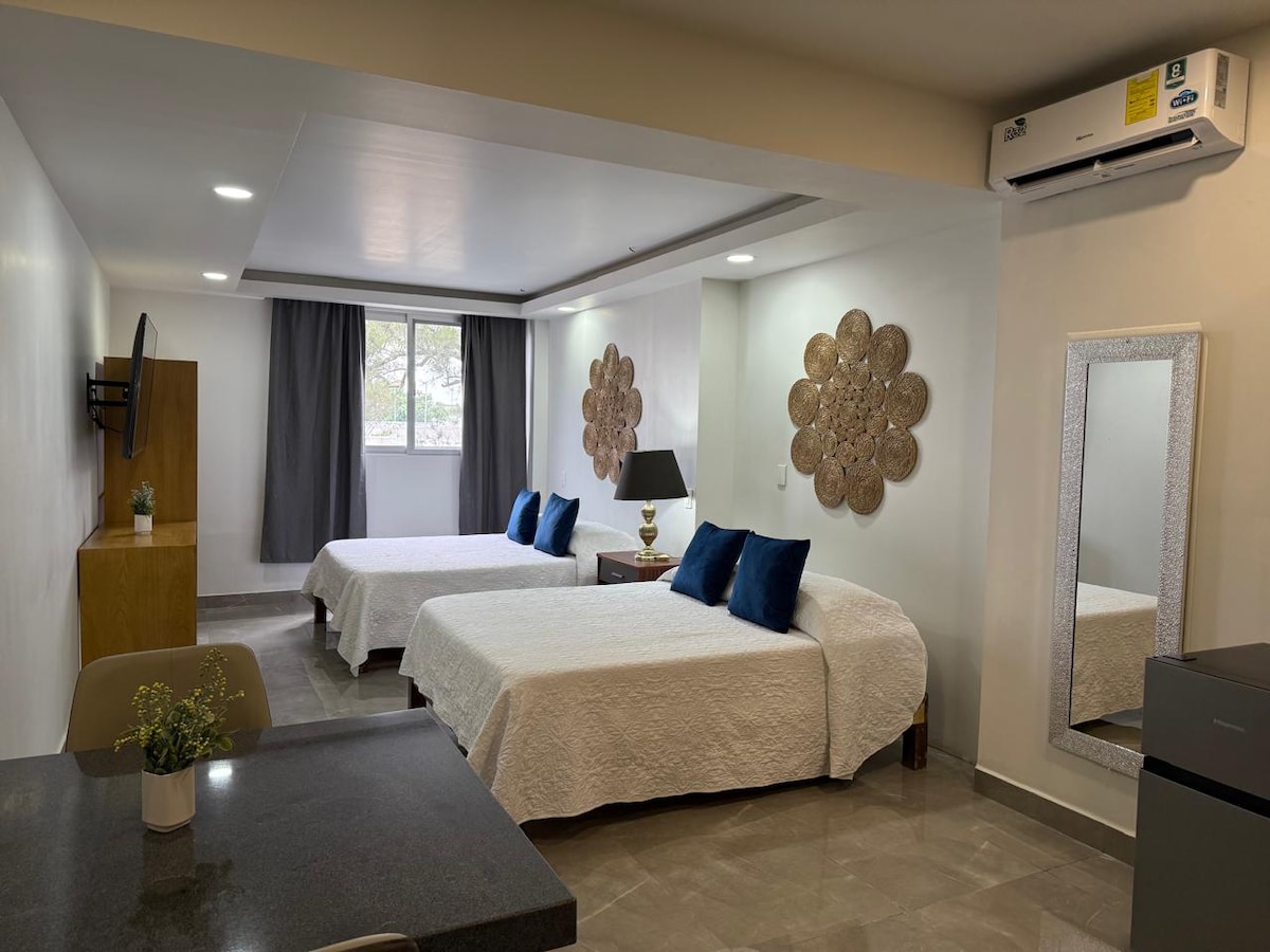 Apartament situat la etajul 9, elegant și central, care oferă o priveliște frumoasă asupra orașului, spațiu unic și confortabil pentru călătorii care caută un sejur de neuitat. Depa este situat în inima orașului Guadalajara, zona chapultepec/Americana, oferind acces ușor la cele mai populare atracții din oraș, inclusiv obiective turistice istorice, cea mai bună zonă culinară și culturală (cafenele, piețe, baruri etc.). Avem 2 terase, piscină și vatră.