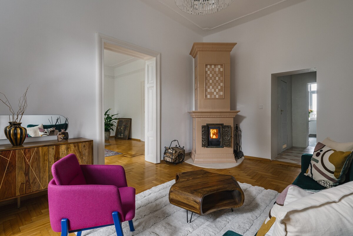 Îți urăm bun venit la Furnace Nook! Aragazul cu gresie este punctul central al apartamentului, aici bate „inima” sa. Această lucrare contemporană a artistului Bieszczady Robert Górka combină avantajele unei sobe cu gresie, căldură radiantă și un șemineu – posibilitatea de a admira focul. Proporția, elegantă, poziționată pe o bază de marmură, perfect îmbinând ușile din fontă, a fost construită pe baza plăcilor de epocă, iar în interior este construită folosind metodele gropii de foc șamotch din zduc.