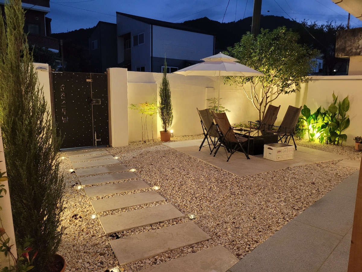 순천 스무날은 🍀 옛순천 중심지에 위치한 전통 한옥이며, 하루 한 손님만을 위한 모던하고 프라이빗한 독채형 감성숙소입니다 서까래를 타고 이어지는 처마선이 이쁜 우리네 전통가옥 한옥에서 아늑한 침실 넉넉한 공간의 거실, 자쿠지와 뒷마당 마루에서 족욕을 하며 마음에 여유를 즐기고 힐링하는 시간을 함께 보낼수 있는 마음이 머무는 한옥독채숙소입니다 순천만 정원, 순천습지,옥리단 카페거리, 문화의 거리,향교등 숙소가까이 즐길거리와 볼거리가 많아요 [인스타] @20_days23
