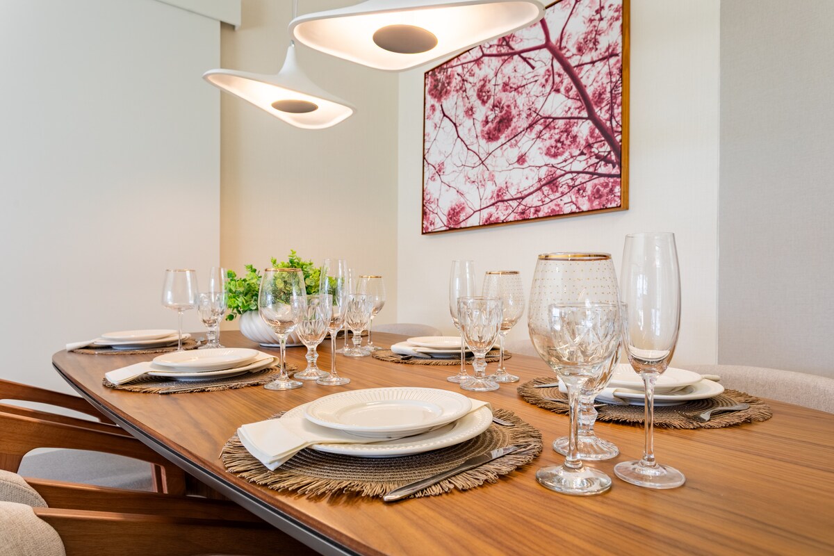 Apartamentul are arhitectură semnată de unul dintre cei mai renumiți profesioniști din Goiânia. Ideea este să te poți simți ca acasă în timpul șederii. Toate automatizate; lumini, perdea, TV, aer condiționat care oferă confort și rafinament, doar cere Alexa. Ascultă muzică, urmărește peste 1.600 de canale deschise și închise. Fă un duș plăcut cu un duș generos. Fă fotografii și odihnește-te pe balcon cu o priveliște senzațională a apusului de soare și tavan acrilic.