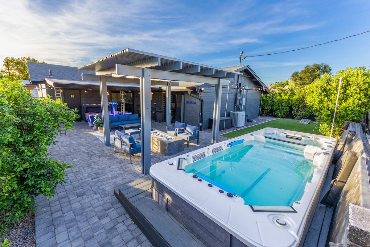 Bucură-te de acest Airbnb de lux situat în inima centrului orașului Gilbert - la doar un bloc est de grătarul lui Joe, Snooze, Bentley Whiskey Row al lui Dierk, piața Gilbert Farmer, Teatrul Hale și multe altele! Această locuință are 2 dormitoare, 2 băi și un loft incredibil pentru a găzdui un număr total de 8. Curtea este perfectă pentru divertisment - completată cu un șemineu pe gaz și vedere incredibilă la Turnul de apă Gilbert! Petrecerile și evenimentele nu sunt permise fără aprobarea gazdei înainte de rezervare + taxă suplimentară.