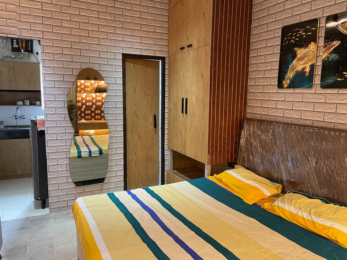 Bine ai venit în acest apartament elegant 1BHK, perfect pentru cupluri sau persoane care călătoresc singure. Spațiul are un living confortabil, cu decor elegant, tavan marmurat, iluminare ambientală și un televizor inteligent. Bucură-te de o bucătărie complet utilată, o baie curată și un dormitor odihnitor. Situat într-o clădire liniștită cu 6 apartamente, oaspeții beneficiază de asistență non-stop de la un îngrijitor de la fața locului. Ideal pentru o ședere confortabilă, cu toate dotările esențiale pentru muncă sau petrecere a timpului liber.